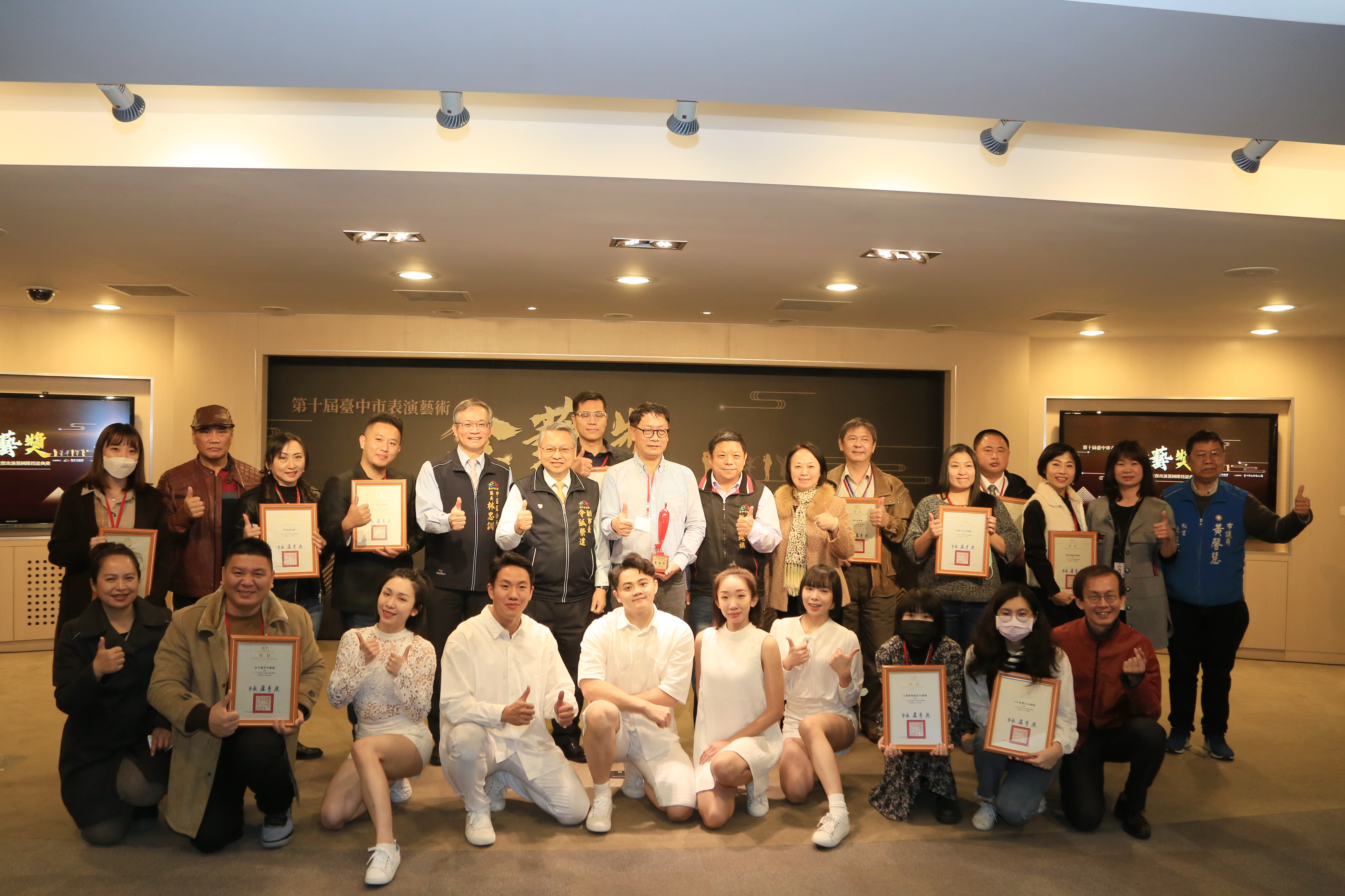 象徵台中市表演藝術最高榮譽的「第十屆台中市表演藝術金藝獎」,今(22)日舉辦頒獎典禮,副市長令狐榮達代表市長盧秀燕出席揭曉得獎名單,由台灣揚琴樂團榮獲殊榮,並獲頒獎座及40萬元獎金;此外,令狐副市長也頒贈獎狀予今年入選「台中市傑出演藝團隊」的12組團隊,鼓勵和肯定獲獎及傑出團隊的努力。