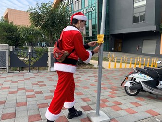 西屯區清潔隊長陳益興提到,為響應台中耶誕嘉年華,同仁化身聖誕老公公與麋鹿騎著電動機車出勤,剛上路時還有點彆扭害羞,不過工作魂一上身,開始認真拆除違規廣告後也就不尷尬了。西屯轄內有市府廣場、新光三越與台中大遠百、秋紅谷及國家歌劇院等著名地標,也都紛紛出現應景裝置及閃亮燈飾,為讓遊客到訪有良好印象,清潔隊努力執行市容維護,同仁也會騎電動機車上路,以環保的方式執行環保工作,做好公部門帶頭節能減碳的模範。