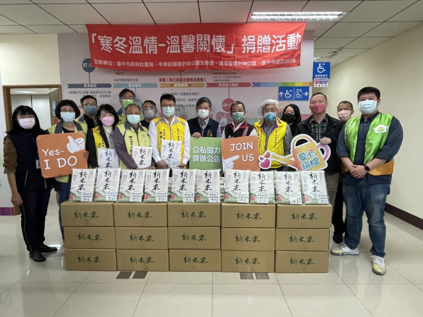 一份11年不間斷的愛心!中華民國會計師公會全聯會、台灣省會計師公會及台中市會計師公會,今(14)日在食物銀行大里店捐贈台中市政府社會局2000包白米,由局長彭懷真代表受贈,之後將分送給台中市愛心食物銀行、台中市原住民族事務委員會、原住民食物銀行及大肚區禾楓慈善老人關懷協會,照顧弱勢民眾。