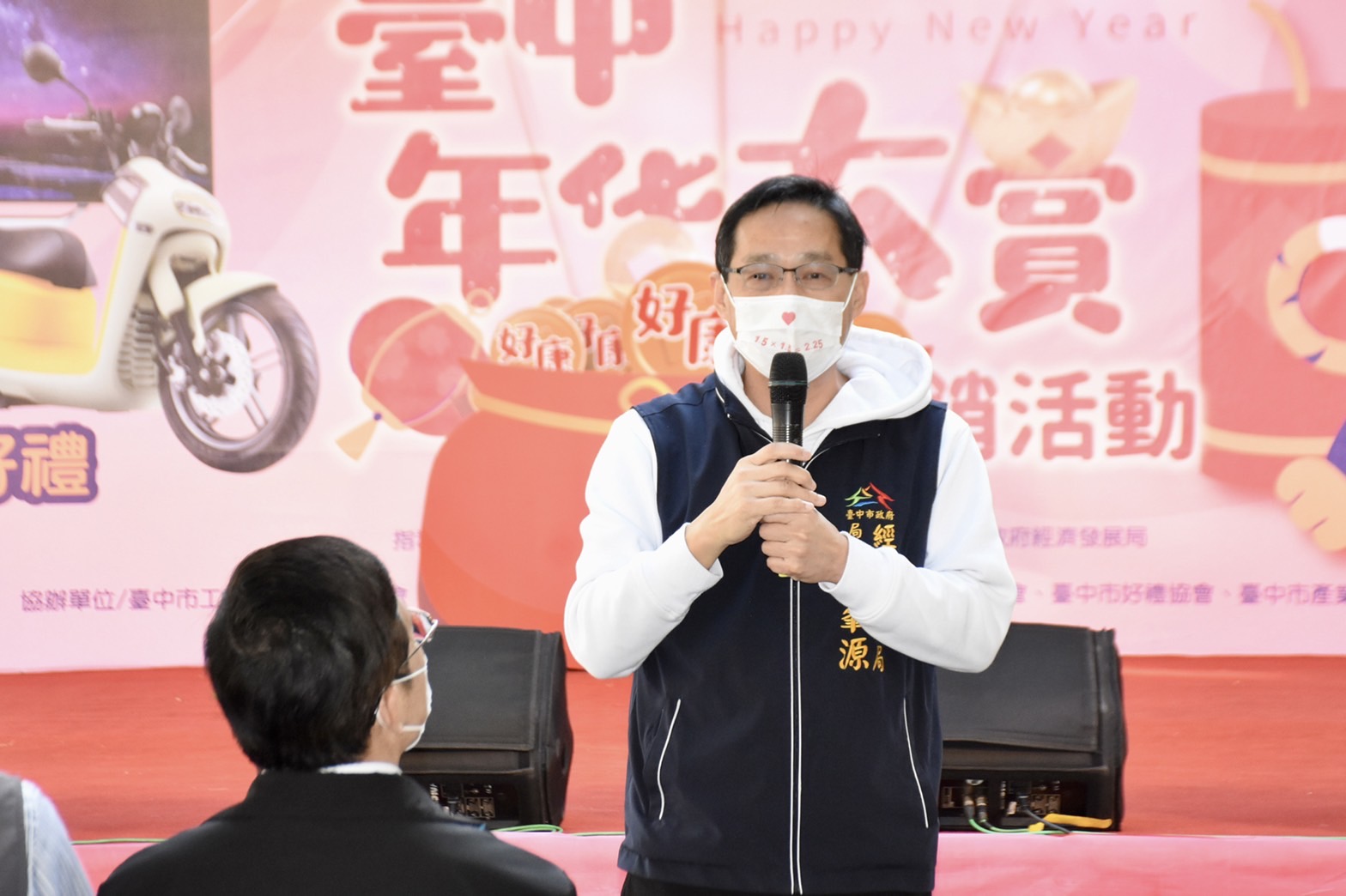 經發局長張峯源出席致詞表示,春節是國人最重視節日,市府規劃兩天年貨大賞活動,幫助大家輕鬆購足年貨,感謝台中市工策會、台中市糕餅公會、台中市直轄市酒類公會、台中好禮協會、產業故事館協會,協助邀集糕餅、酒類、伴手禮等40家業者共襄盛舉,也勉勵大家即使疫情有升溫趨勢,新的一年仍要滿懷希望。