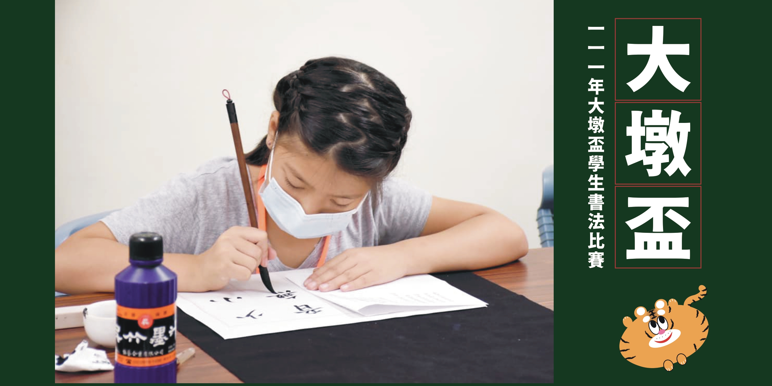 文化局指出,「大墩盃學生書法比賽」今年已邁入第17屆,適逢農曆春節過後即展開收件,今年比賽特別推出可愛的吉祥物「墨墨虎」,更將徵件DM設計成春聯斗方造型的「虎哩愛寫字」(閩南話:讓你愛寫字),希望在新年假期陪伴年輕學子勤練書法,寫下新學期新希望,祝福學業進步!
