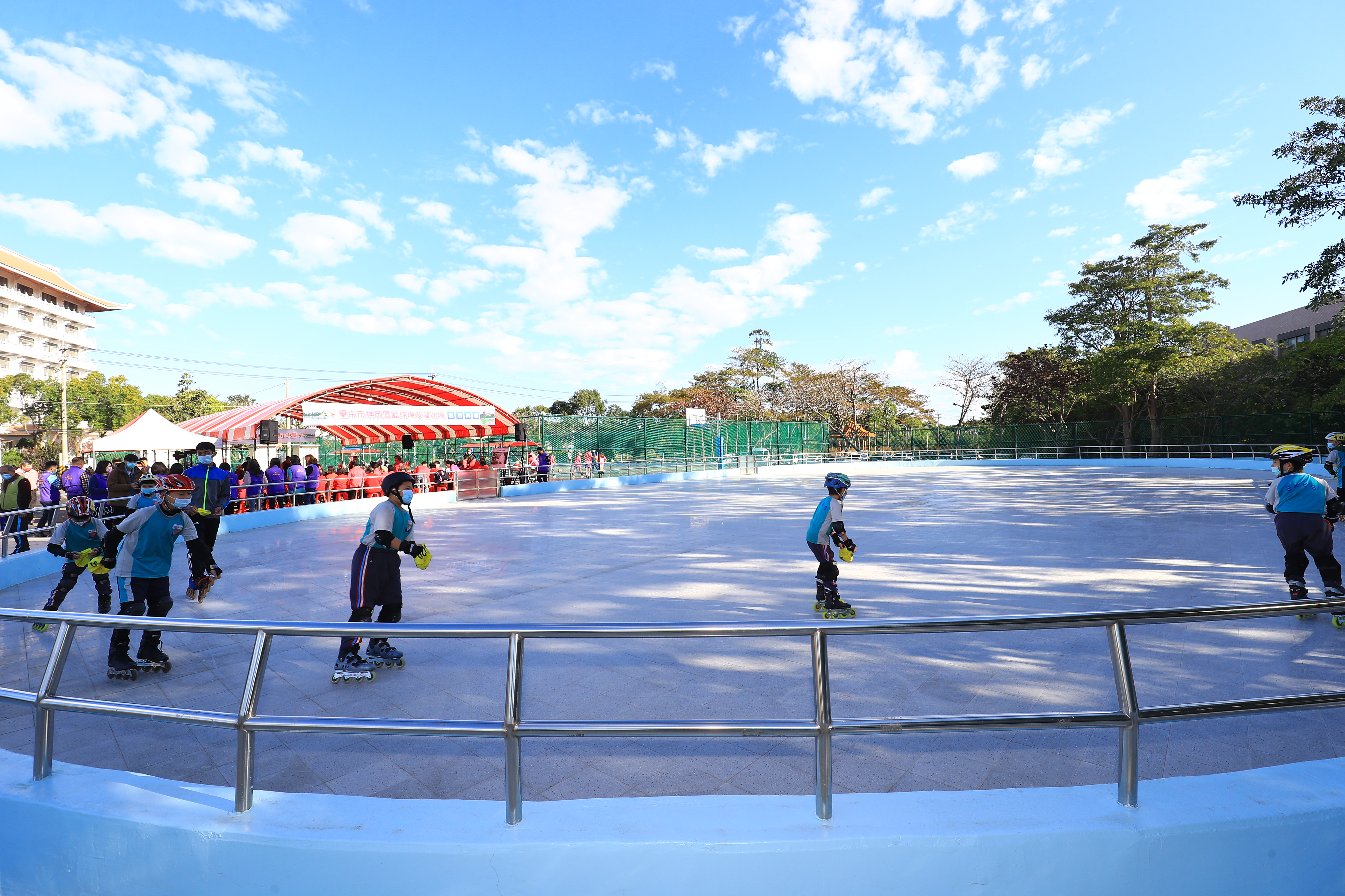 神岡區籃球場與溜冰場擁有PU地板與磨石子地坪,嶄新設備今日一開放即吸引民眾踴躍使用,盧市長今日到場關心,更致贈開場表演的小朋友虎年小紅包,氣氛熱絡。盧市長表示,神岡游泳池舊址過去多年無人整理,變成治安死角並遭棄置垃圾,感謝各方努力促進改建活化,此改建工程經費共800多萬元,讓游泳池變成籃球場、溜冰場及廣場,不只有台中較少見的溜冰場、符合比賽規格的籃球場,還有廣場可讓餐會、婚禮等聚會使用,更有監視器可管理治安,啟用後希望大家多多運動,落實「酷台中、酷運動」。