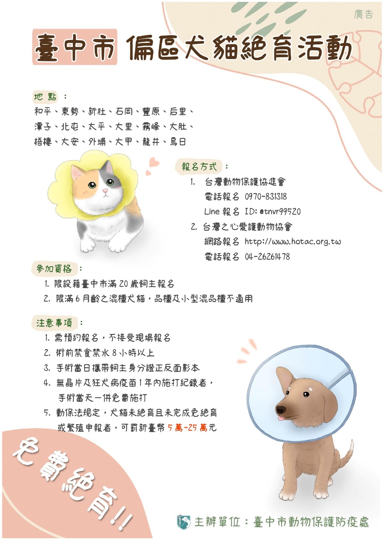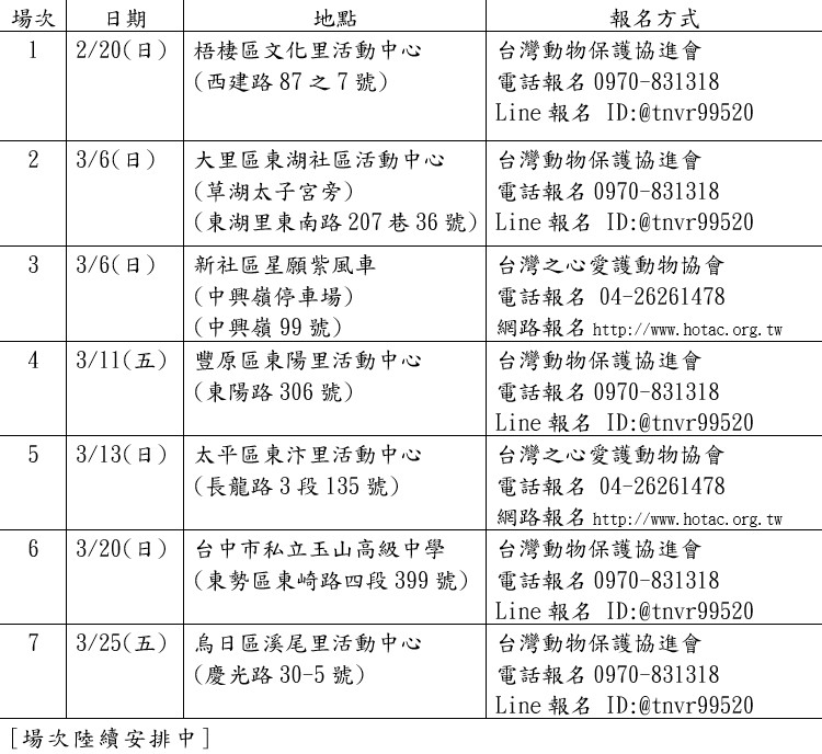 動保處說明,活動需預約報名,不接受現場報名;活動限犬貓飼養地點在台中市,同時飼主必須是設籍在台中市、年滿20歲的成年人報名;參加活動犬貓限滿6月齡的混種犬貓,品種及小型混品種犬貓不適用;參加活動犬貓需健康狀況良好,並於活動手術前至少禁食禁水8小時以上。