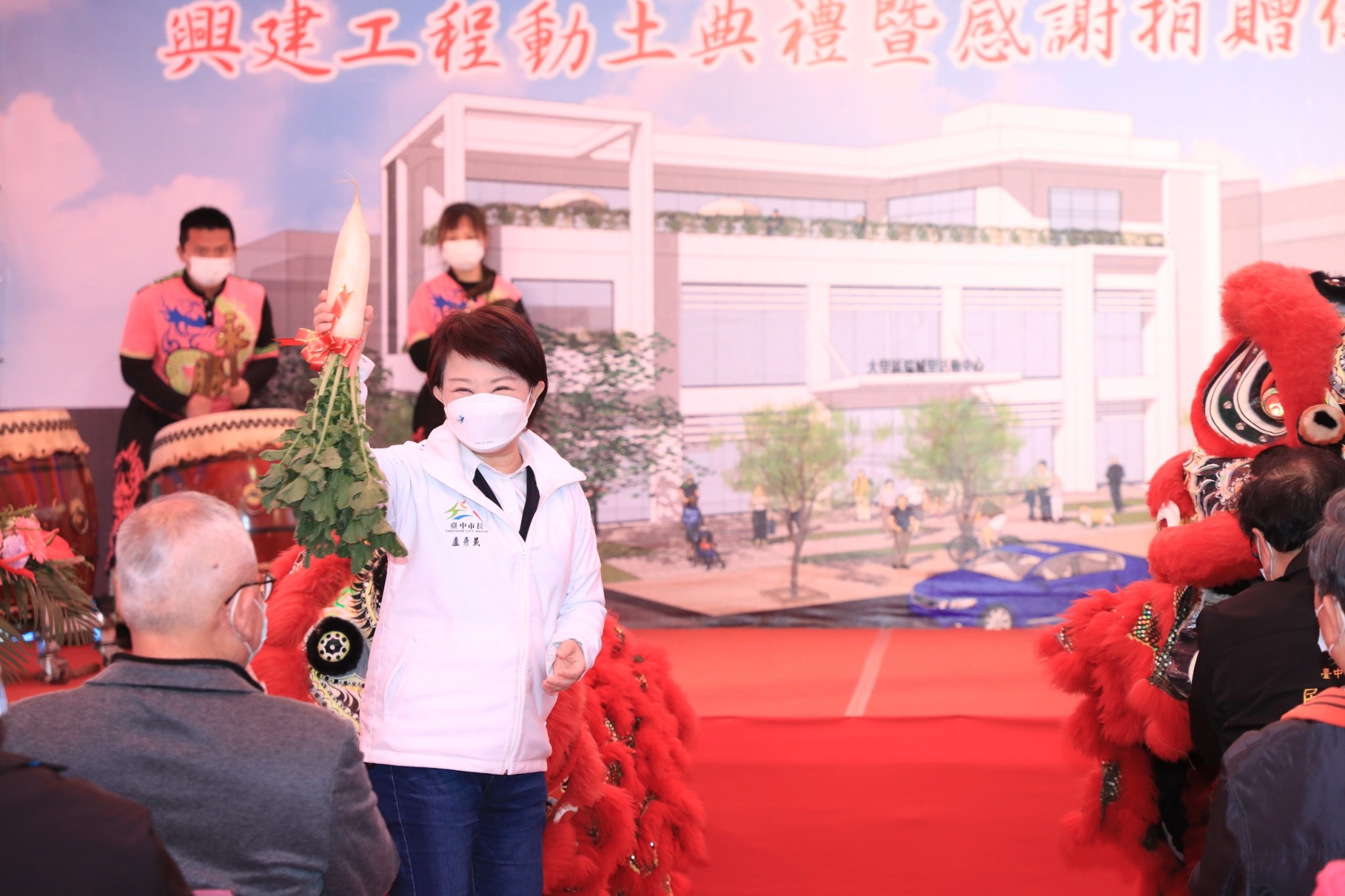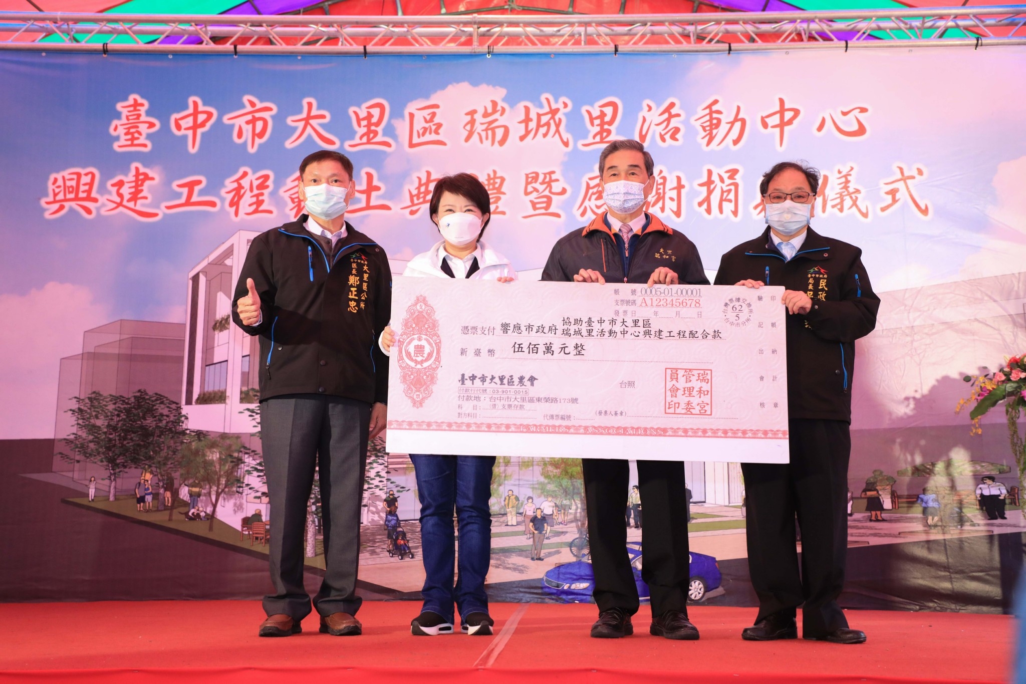 今日動土典禮,市長盧秀燕、民政局長吳世瑋、大里區長鄭正忠;台中市議員林碧秀、蘇柏興、張滄沂、林德宇、李天生、賴義鍠、段緯宇,瑞和宮主委黃源泉、大里區農會總幹事賴東陽和常務監事賴樹清,瑞成里長蔡昭奮等多位里鄰長,及立委何欣純服務團隊均到場。(2/21*3)*民政局