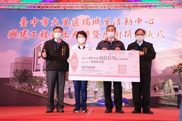 台中市大里區公所今(21)日舉行「瑞城里活動中心興建工程動土典禮」,工程總經費4,2275,390元,預計明年5月底完工。市長盧秀燕今日出席活動並頒贈感謝狀,感謝瑞和宮捐贈500萬元,協助地方推進建設,與市府一同為市民打造多元的活動場域。