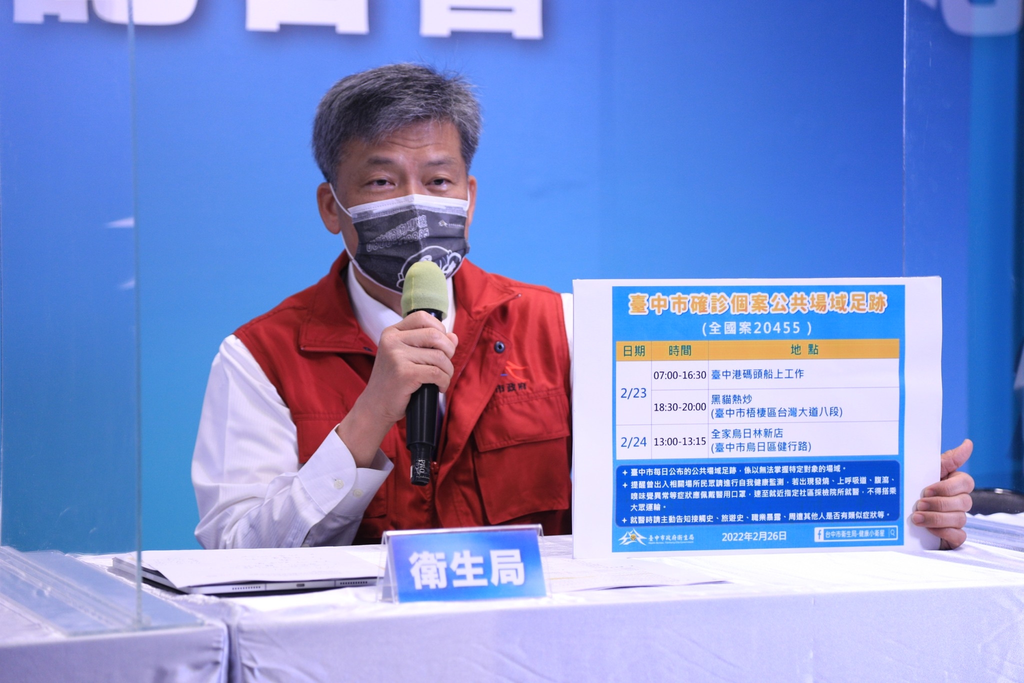 衛生局長曾梓展表示,該個案去年8月5日、10月18日接種2劑AZ疫苗,今年2月8日接種第3劑莫德納疫苗;去年12月26日自新加坡入境,居檢期滿PCR採檢陰性。個案因職業需要,登船前須出示PCR陰性證明,2月14日、19日採檢PCR皆為陰性,後續2月23日至台中港船上工作,工作期間有穿著全套防護裝備,當日下班後與同事至梧棲區黑貓熱炒聚餐;24日個案無不適症狀,曾於全家便利商店買東西吃,因預計前往高雄港工作,因此至台中市醫院採檢,檢驗結果PCR陽性(CT值23.2),收治於醫院負壓隔離病房。(2/26*16)*衛生局