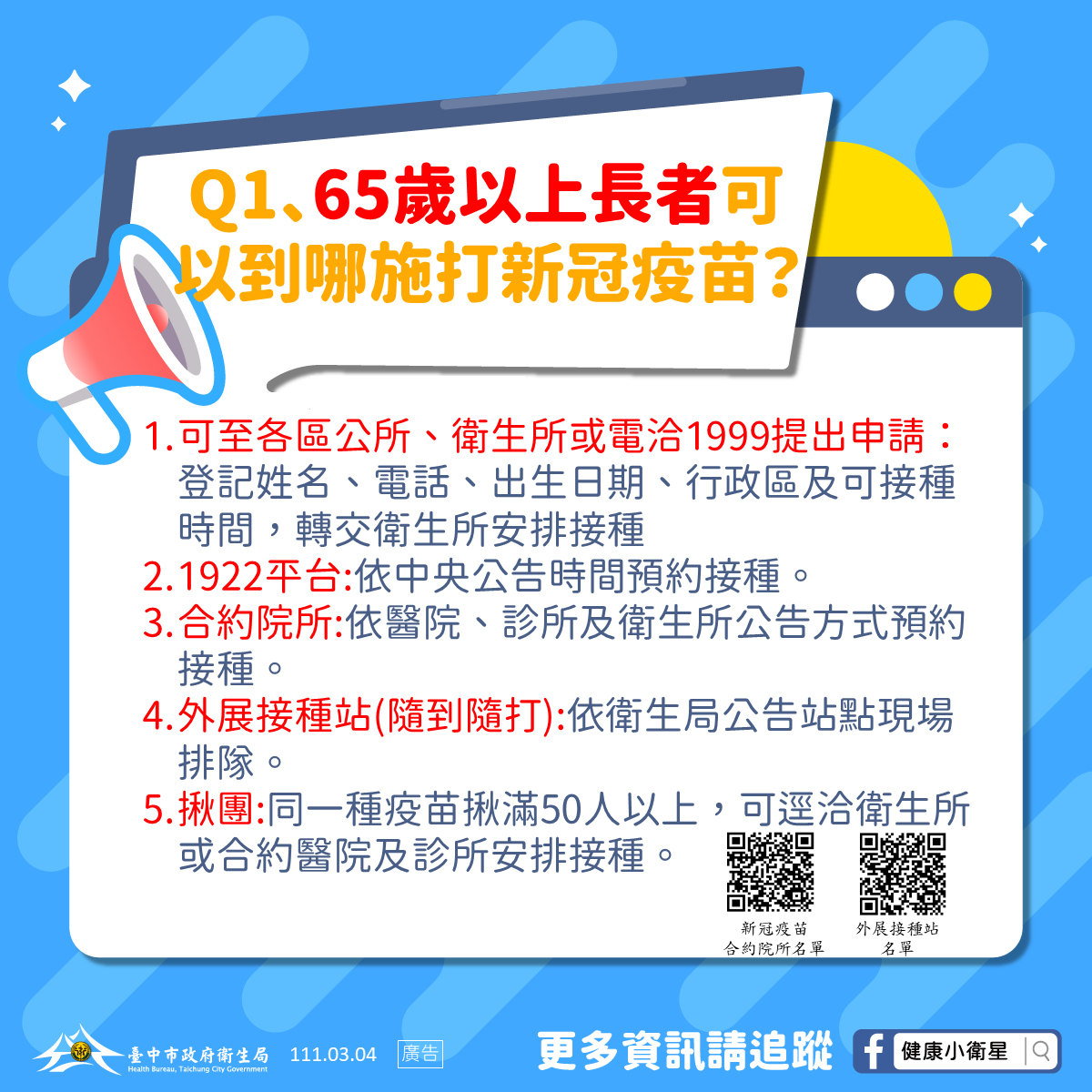 衛生局說明,此方案主要以65歲以上長者網路資訊使用性、諮詢管道及接種疫苗地點習慣性等進行規劃,具網路使用能力及便利性長者可直接於1922平台或至衛生局網站查詢開診院所名單進行預約;針對網路使用不便長者,只要聯繫區公所、衛生所或撥打1999市民專線,受理單位即會協助登錄長者資料、轉交衛生所完成預約,並通知長者依預約時間、地點前往接種。
