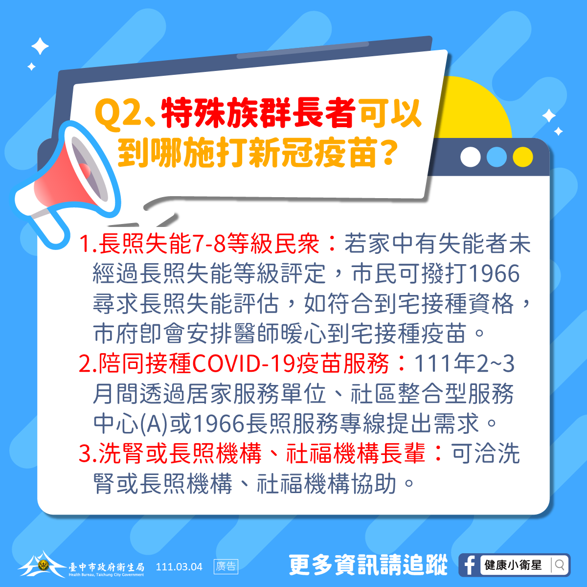 衛生局表示,市府針對特殊照護需求長者也安排完善接種措施,例如長照失能7-8等級民眾,可向居住地區公所提出到宅接種申請,市府即會安排醫師暖心到宅接種疫苗;長照或社福機構受照顧者或洗腎病患,也可直接洽詢該居住機構或洗腎院所,協助安排到點接種。