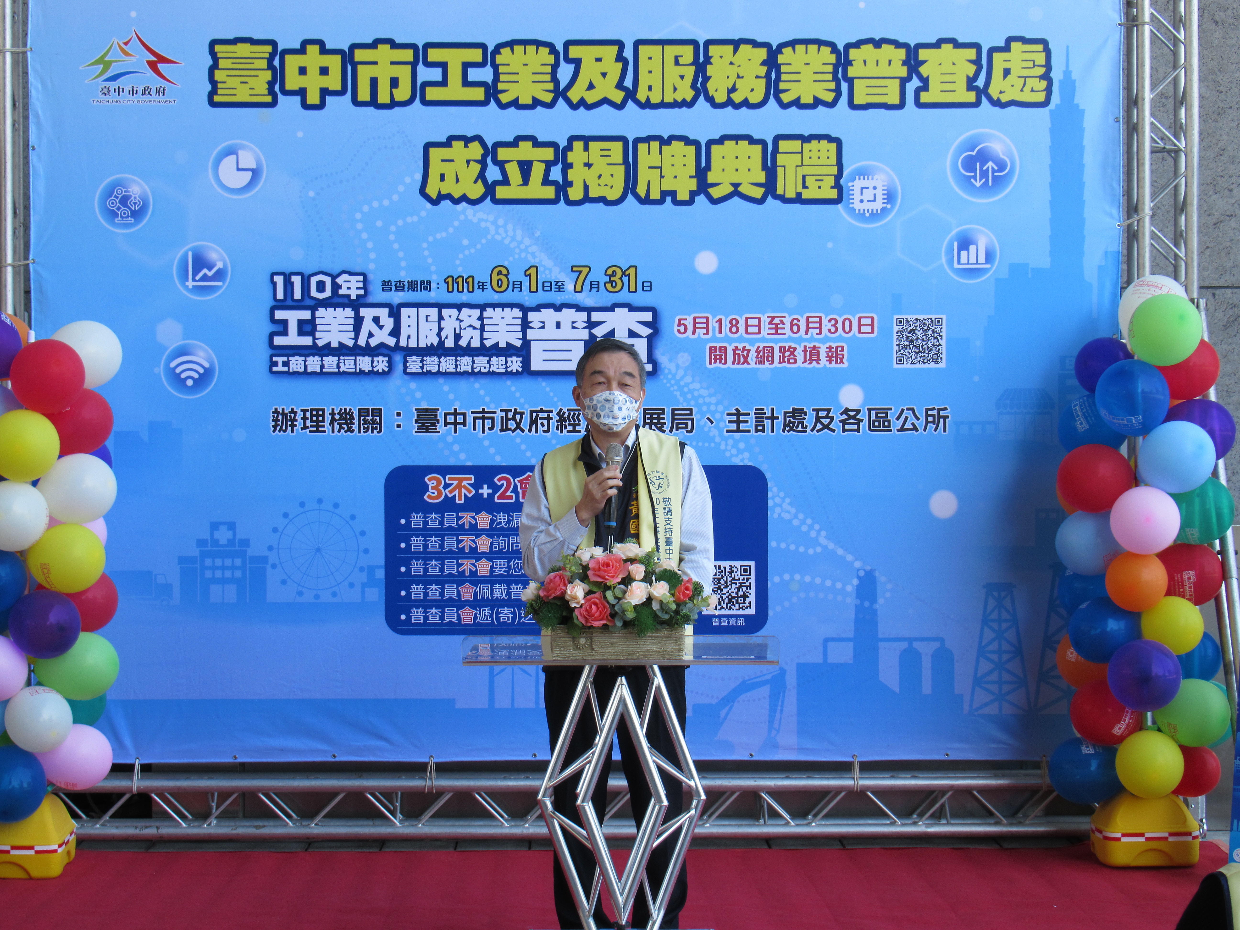 110年工業及服務業普查將於3月正式啟動,為順利推動普查工作,台中市政府今(10)日舉行「台中市工業及服務業普查處」成立揭牌典禮,副市長黃國榮代表市長盧秀燕出席時指出,每5年辦理1次的工商普查即將展開,全市預計將訪查20萬商家,動員人力近1,500名工作人員來辦理此次工作,「規模為歷年來之最」,在此先感謝市府主計處、經濟發展局、民政局、衛生局、教育局及區公所等同仁的辛勞!