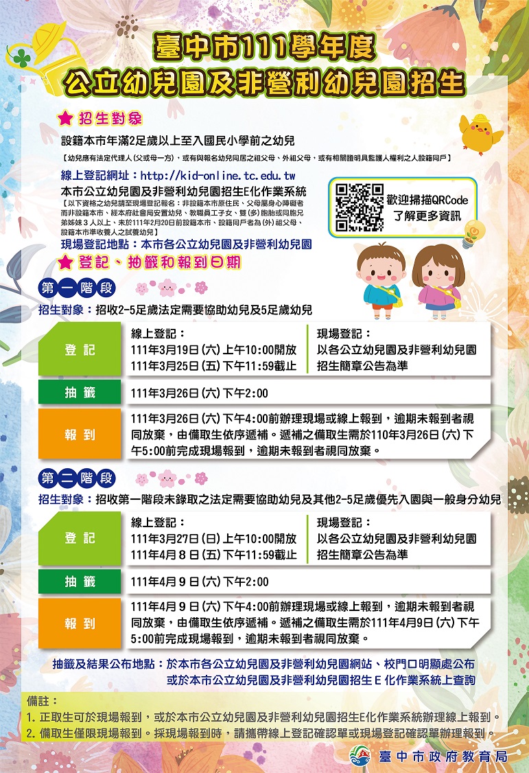 111學年度台中市公立幼兒園及非營利幼兒園,將自3月起陸續公告招生簡章,此次招生援例分二階段辦理,第1階段自319日至26日止,第2階段自327日至49日止,請家長於期限內辦理報名登記。教育局表示,今年因應疫情,仍採現場及線上登記報名雙軌並行,另採電腦化抽籤、以及線上或現場報到方式,全程免出門、免排隊,健康又安心。