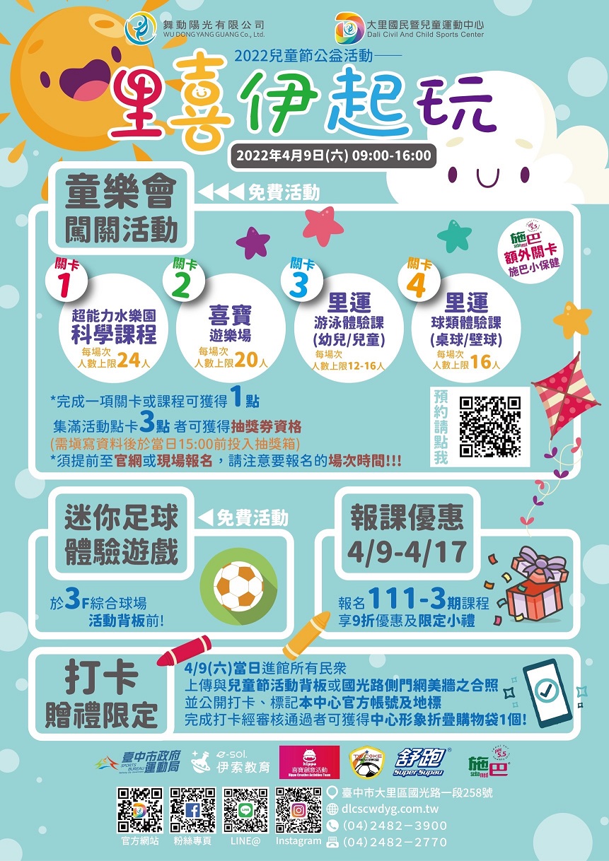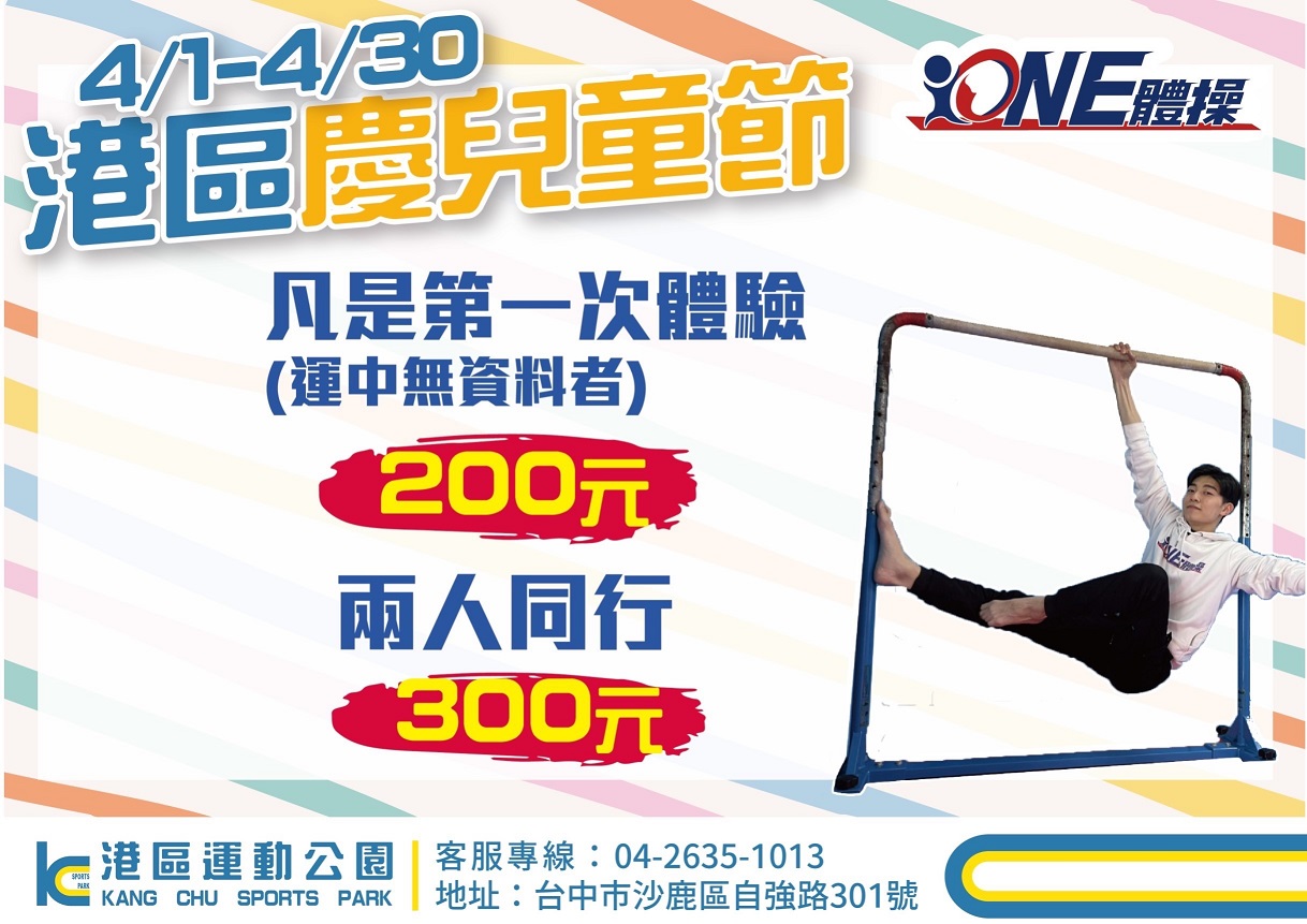 兒童節連假將至,台中市長盧秀燕積極推動兒童運動發展,設置全國首創國民暨兒童運動中心,讓全家大小都能一起健康動起來。為提升城市運動風氣,響應兒童節連假,各國民運動中心及港區運動公園規劃多項兒童與親子專屬活動及課程,並提供多項優惠方案,促進全民運動風氣,歡迎民眾踴躍參加。