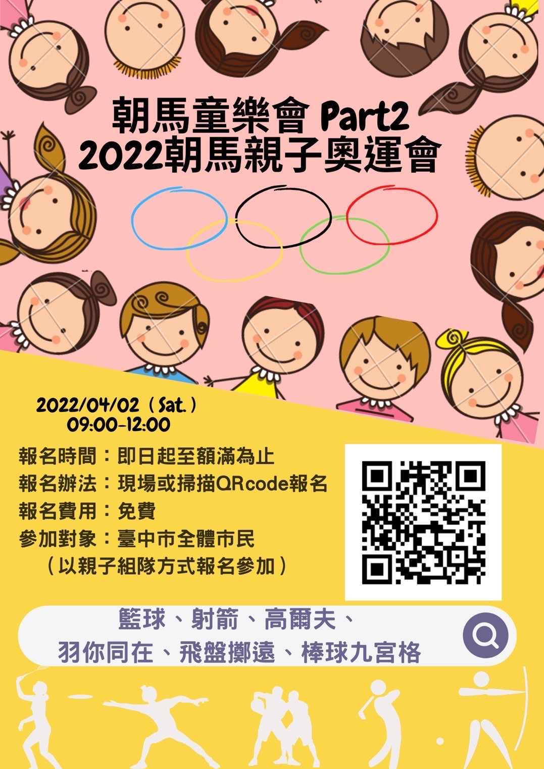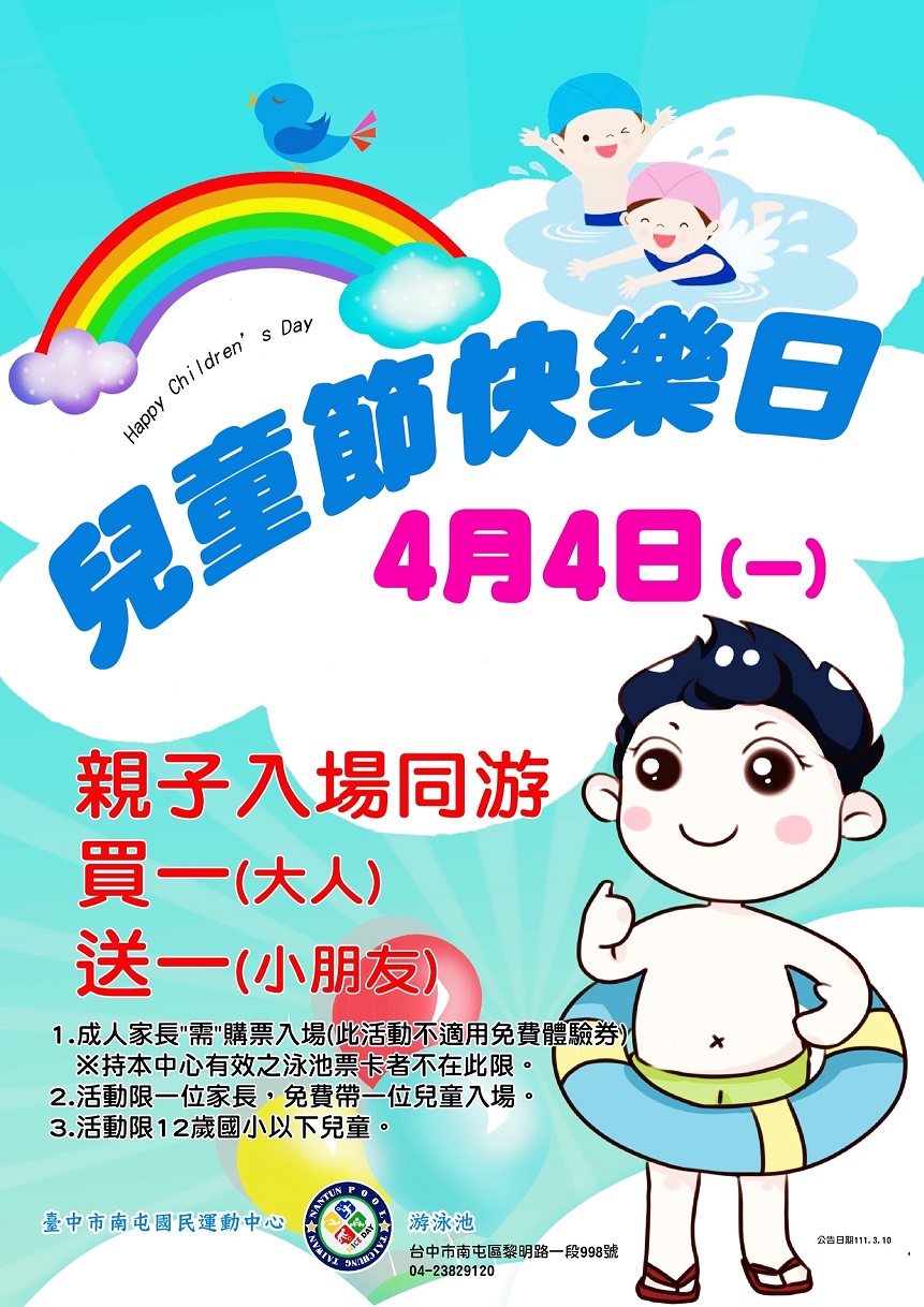 運動局說明,因應國內疫情,各國運中心嚴格落實防疫作為,並響應兒童節連假,提供豐富的兒童與親子專屬運動課程,如朝馬國民運動中心明日將舉辦「朝馬親子奧運會」,邀請親子組隊報名參賽;南屯運動中心規劃4月4日當天為「兒童節快樂日」,每一位家長購票使用游泳池設施,即可同步免費帶一位12歲以下兒童入場使用。