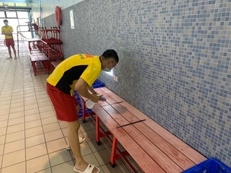此外,針對人流較多的游泳池、健身房、球場等公共區域則加強清消作業、提高消毒頻率,於課程結束後全面消毒,並在多處設置酒精供民眾使用,呼籲市民遵守防疫規定,一同建立安心的運動場域。