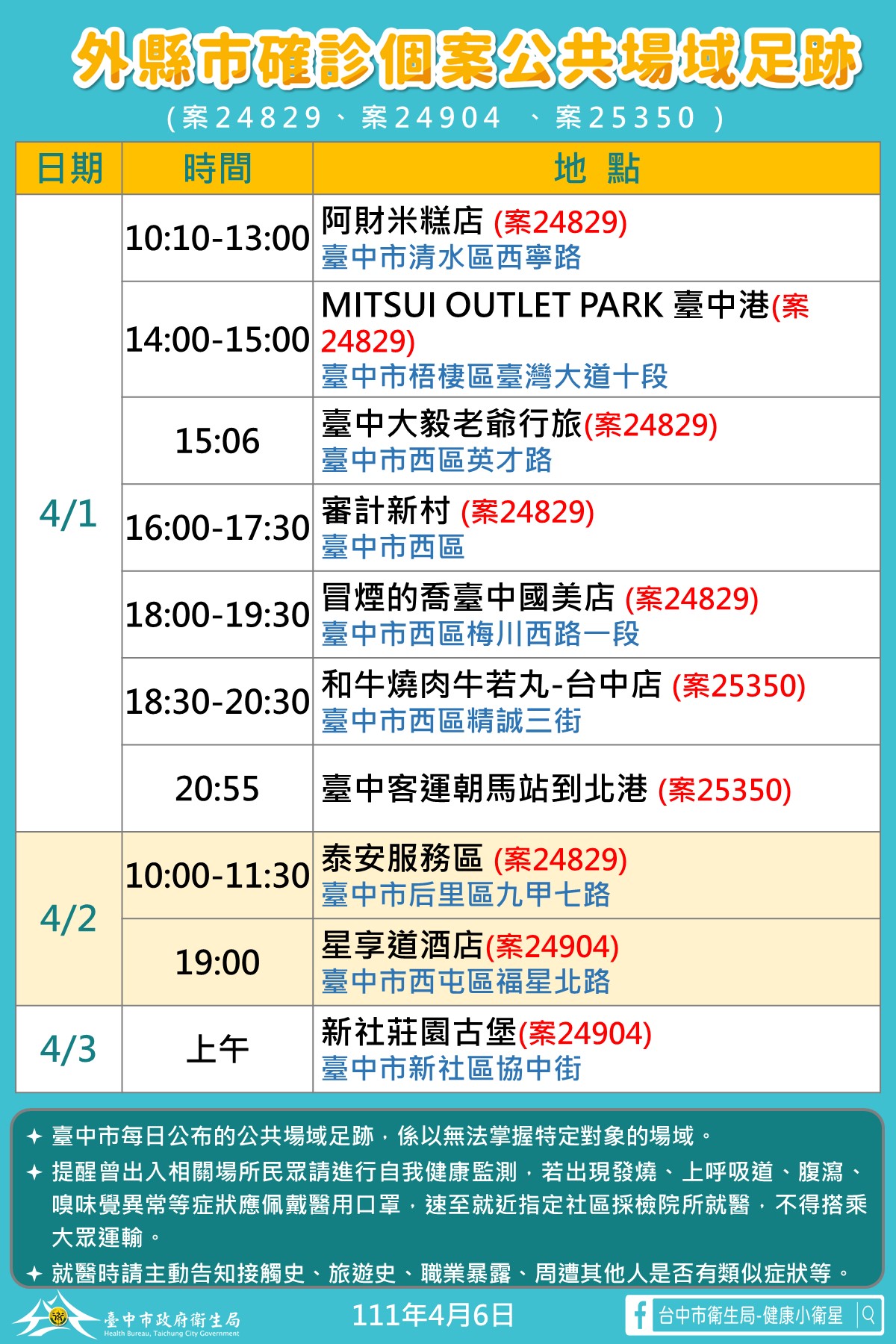 此外,今接獲外縣市確診3名個案台中足跡點,包括4月1日清水區阿財米糕店、MITSUI OUTLET PARK台中港、西區大毅老爺行館、審計新村、冒煙的喬台中國美店、西區牛若丸和牛燒肉台中店、台中客運朝馬站;4月2日泰安服務區、星享道酒店;4月3日新社莊園古堡等,已通知業者完成清消作業,呼籲有足跡重疊民眾可至社篩站進行篩檢。