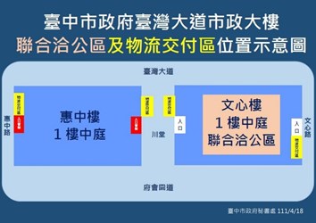 秘書處表示,由於各縣市確診數增加,考量全台已是密不可分的共同生活圈,市府設置聯合洽公區,除可縮短洽公時間,降低民眾非必要接觸風險,也能確保公務運作順暢,以積極投入防疫及各項為民服務工作。此次調整市政大樓門禁管制,民眾洽公請改至台灣大道市政大樓文心樓1樓、文心第二及陽明市政大樓1樓中庭申辦。