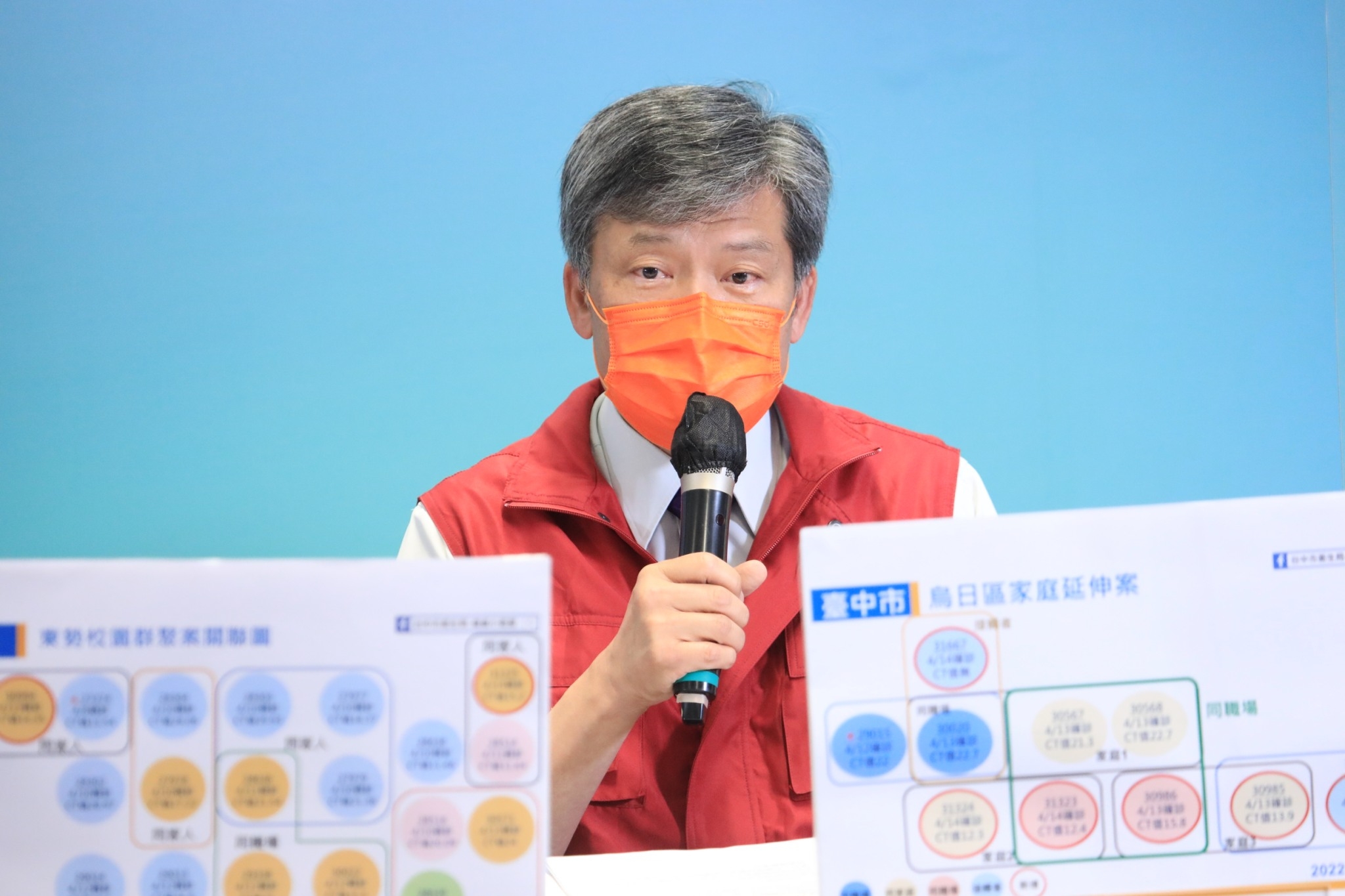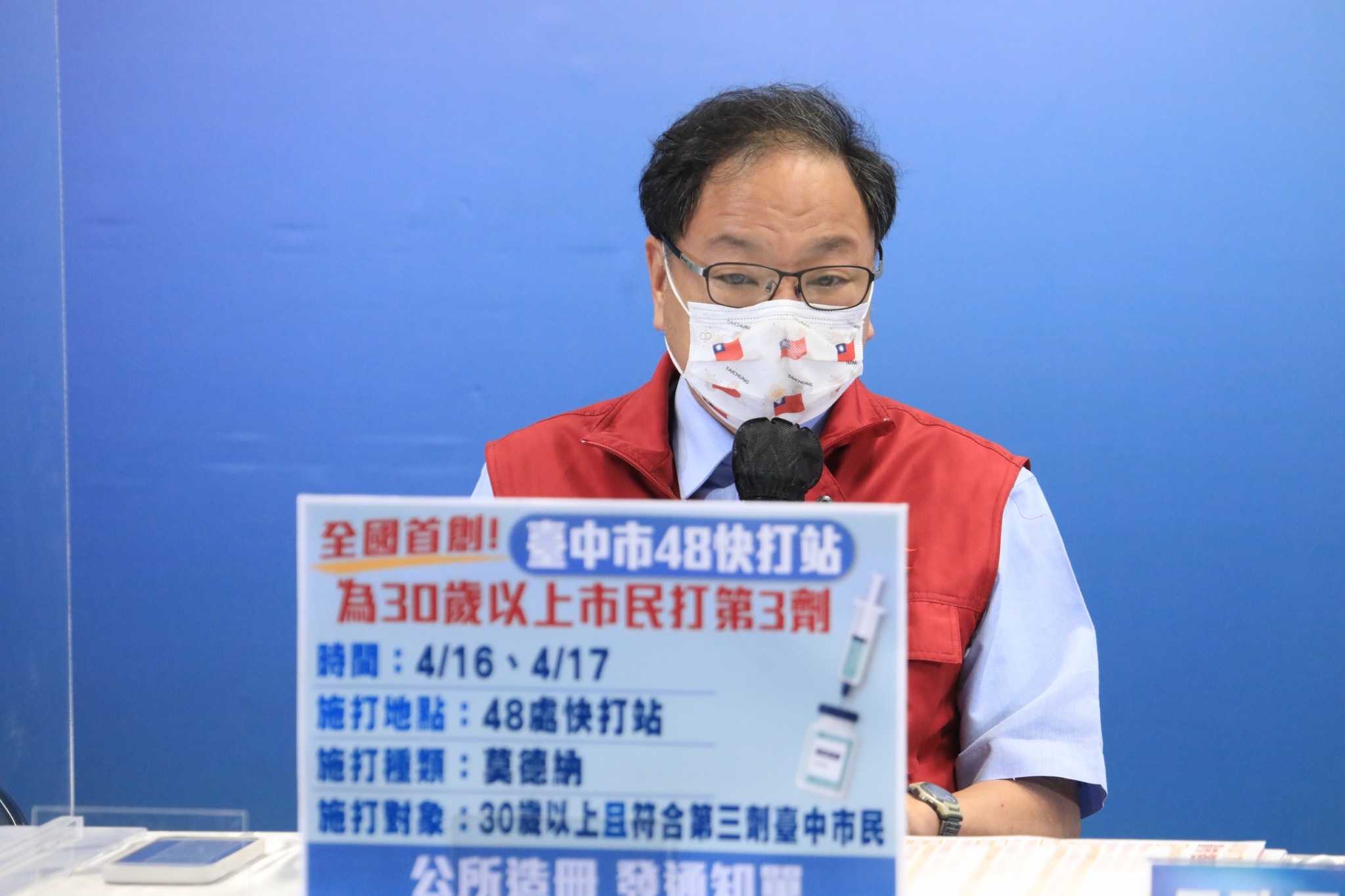 台中市今(15)日新增33例本土確診個案,今日新增感染案例分為四類,包括外縣市足跡或接觸確診者新增14例、已知群聚案新增11例、密切接觸者增3例、感染源不明或疫調中新增5例。市長盧秀燕今日召開防疫記者會表示,全國新增確診破千例,疫情持續升溫,絕對不能鬆懈,這個週末41617日,台中首次將快打站服務向下開放到30歲以上,讓平日繁忙的市民利用假日前往施打第三劑莫德納,守護市民健康。