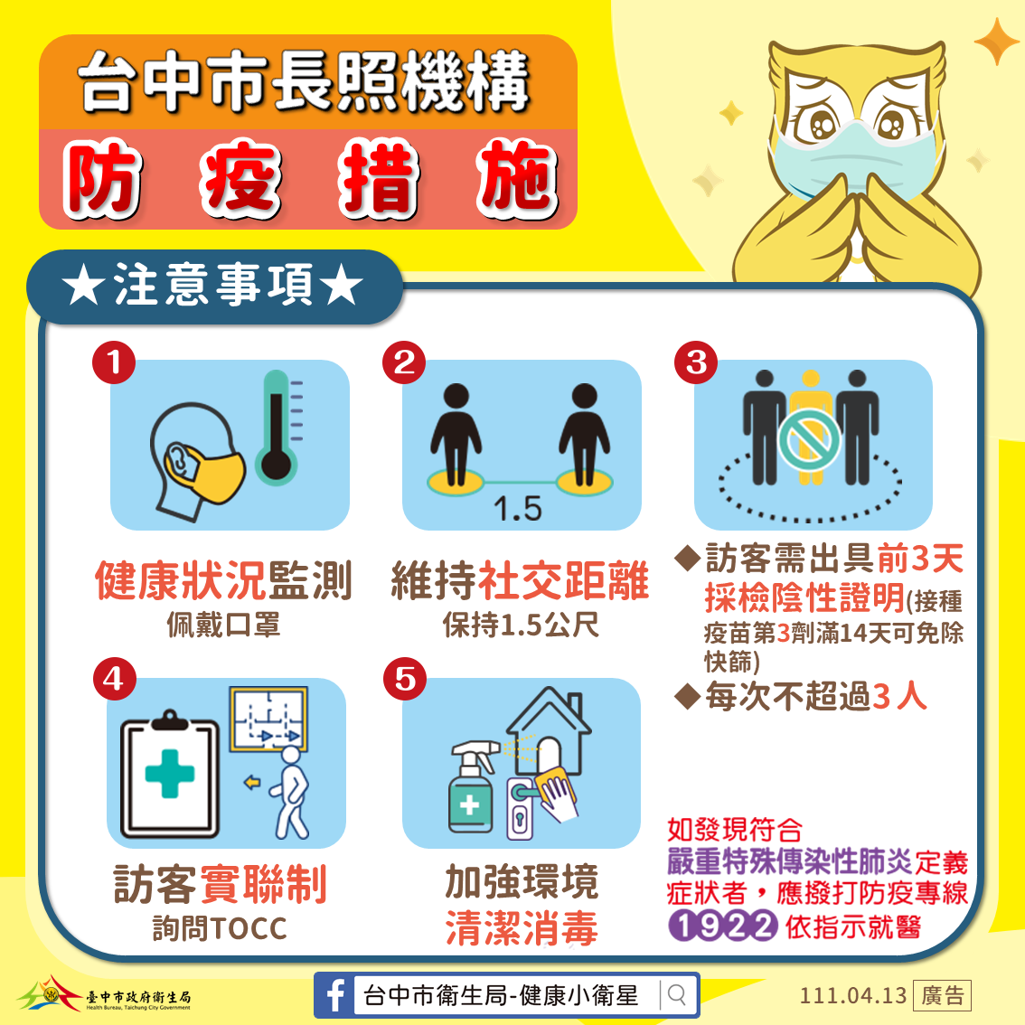 台中市政府衛生局籲請長照機構落實各項防疫措施,以全力圍堵疫情,也請市民配合打滿3劑疫苗再到機構探視。衛生局表示,已於今年2月底前完成一般護理之家及住宿式長照機構之防疫措施實地輔導查核作業,包括機構各項防疫措施的建置情形、各項感染管制書面文件、機構人員訪談、抽測工作人員正確洗手,以及疫苗施打情形。