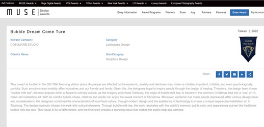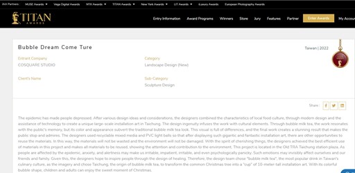新聞局指出,疫情使人們鬱悶不已,經過各種設計思路和考慮,結合在地飲食文化的特色,以及結合節慶氛圍,創造了獨特的珍奶耶誕樹,不僅所有材料都能重複使用,也表現出對環境的關注和貢獻。使用可回收的混合介質和PVC燈球,以便在展示之後,還有其他機會重複使用這些材料。也因此獲得美國繆思設計獎景觀設計類金獎,以及國際地產大獎景觀設計類金獎殊榮。