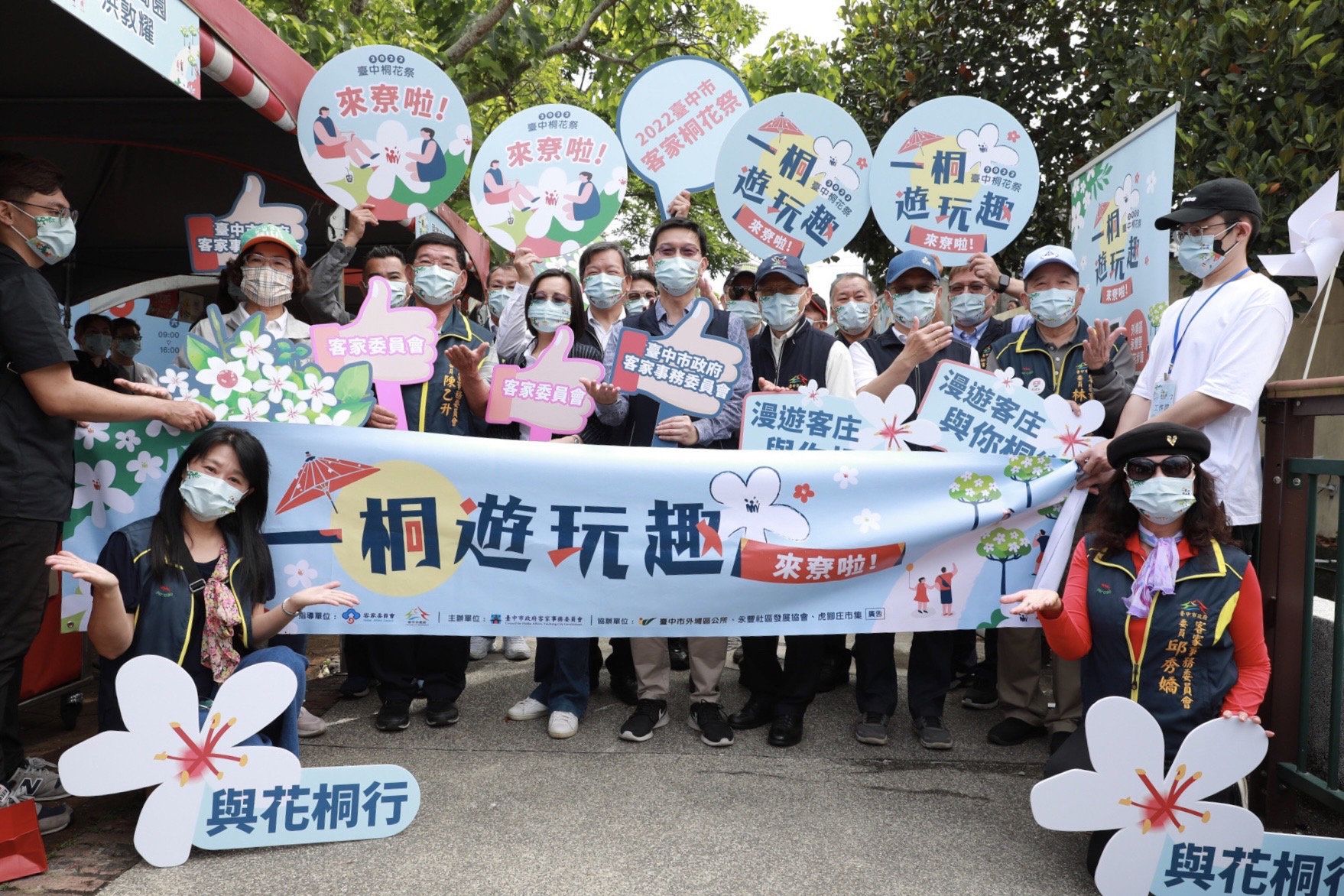 台中市政府客家事務委員會今(23)日在外埔區水東流桐花步道舉辦「2022台中桐花祭—一桐遊玩趣」,安排音樂會、農夫市集等活動,趁著桐花綻放的時節,鼓勵民眾親近自然,漫步在水流東桐花步道,體驗在地自然及人文風情,一賞桐花盛開之美。