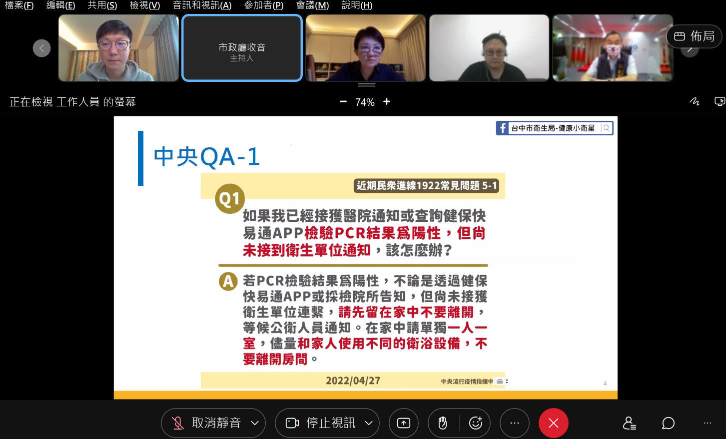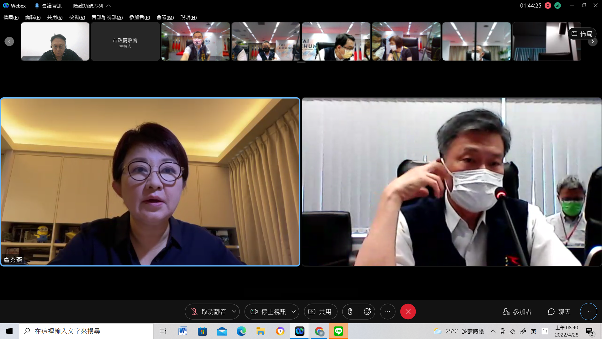 台中市長盧秀燕昨日獲悉和訪客確診者接觸後,立即依照政府「3+4」規定進行居家隔離,居隔期間透過遠端視訊,持續參加會議和決策,今(28)日上午8時隨即以視訊主持市府防疫會議。盧市長表示,防疫關鍵期,邀請全府同仁,包含各局處首長及防疫長就關鍵措施進行討論。席間盧市長針對疫苗施打情形、快打站的設置及學校停課標準等與各局處展開對談。