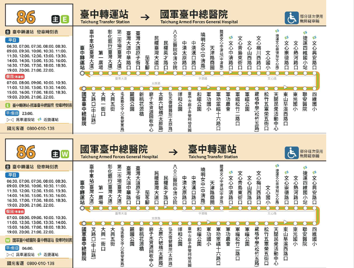 葉局長表示,86路自國光客運台中轉運站發車,沿途行經台灣大道、民權路、忠明路至國軍台中總醫院中清分院,續行中清路、文心路、松竹五路二段、軍功路及太原路等路段,抵達太平區國軍台中總醫院後直接依原路線折返。除兩院區外亦停靠台中車站、捷運文心中清站、文心崇德站、曉明女中、文心國小、四維國小、東光國小、葳格中學及軍功國小等大眾運輸場站及學校,增加沿線民眾通勤、通學的選擇。