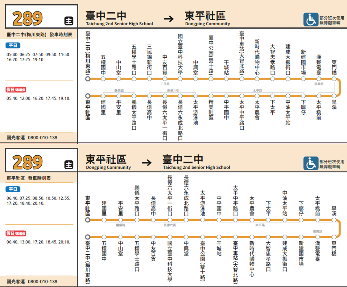 交通局說明,86路主線每日營運服務時間自06:30至22:00,另外有2班區間車;289路每日營運時間自5:40至20:10,兩路線皆使用低地板或通用無障礙車輛,提升上下車的安全及便利性。欲查詢相關資訊可至「台中市即時公車動態資訊」網站( http://citybus.taichung.gov.tw ),或下載「台中公車APP」( https://is.gd/MTPvdg )。如有問題可撥免費專線「1999」,歡迎民眾多加利用。(4/29*12)*交通局