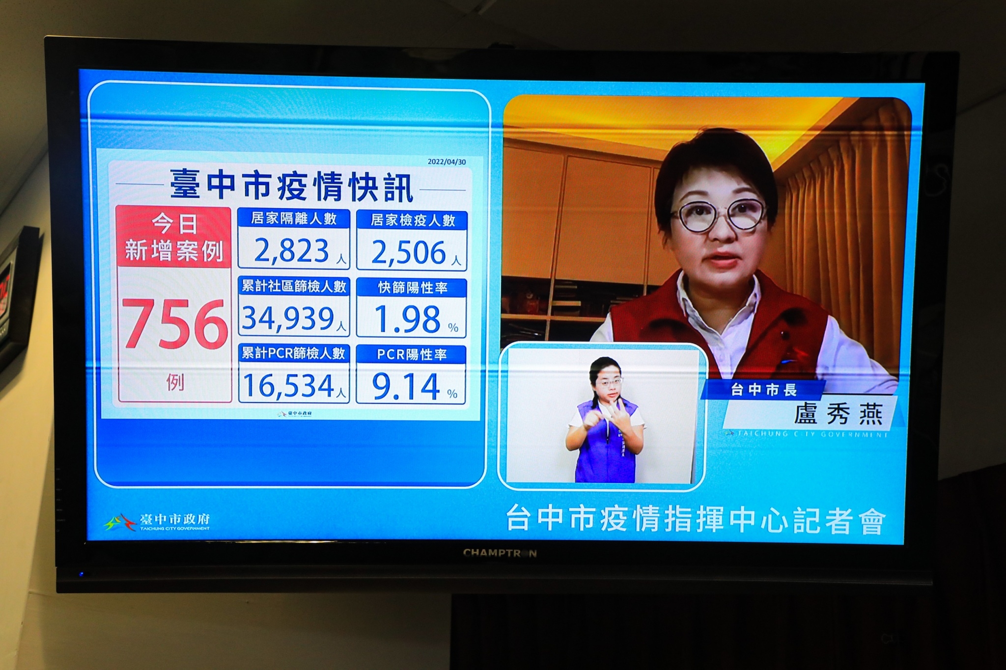 全國今(30)日本土確診新增1萬5033例,台中市本土個案新增756例,包含校園群聚77例、職場群聚72例與家庭、朋友群聚176例。市長盧秀燕今日持續透過遠端視訊主持防疫記者會,她說,今天是她居家隔離3+4的第四天,開始自主防疫,除了4月27日快篩陰性外,今天再次快篩也是陰性。她也提醒,今天起是五一連假,希望大家外出口罩戴緊緊,減少到人潮多的地方,保護自己、守護家人!