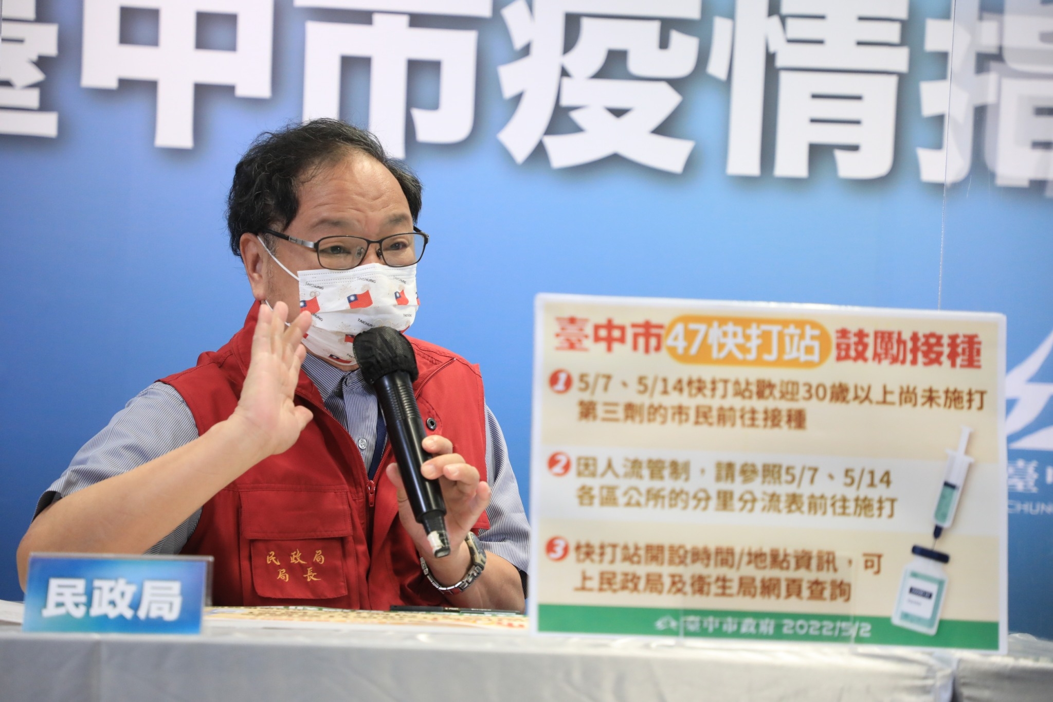 盧市長也說,30歲以上還未打第三劑的市民,也能到快打站施打疫苗,由於中市30歲以上市民,市府先前已發送疫苗注射通知單,因此30歲以上「補打」的民眾,不用帶通知單,只要帶身分證、健保卡與小黃卡,依戶籍里的施打時間,到指定的快打站打疫苗即可;5月14日施打對象則再放寬至18歲以上未施打第三劑的市民,通知單收取對象約9萬人,呼籲未施打第三劑的市民,踴躍前往施打。另外,尚未施打第一劑、第二劑且符合施打條件的民眾,也可前往快打站施打。
