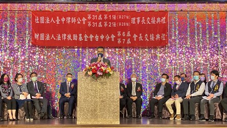 昨日典禮,包含法制局長李善植、勞工局長張大春、台灣高等檢察署台中檢察分署檢察長謝榮盛、台灣台中地方檢察署檢察長黃謀信、全國律師聯合會理事長陳彥希、法扶基金會前董事長林春榮、財團法人犯罪被害人保護協會台灣台中分會主任委員陳怡成等人均一同觀禮。(5/3*12)*法制局