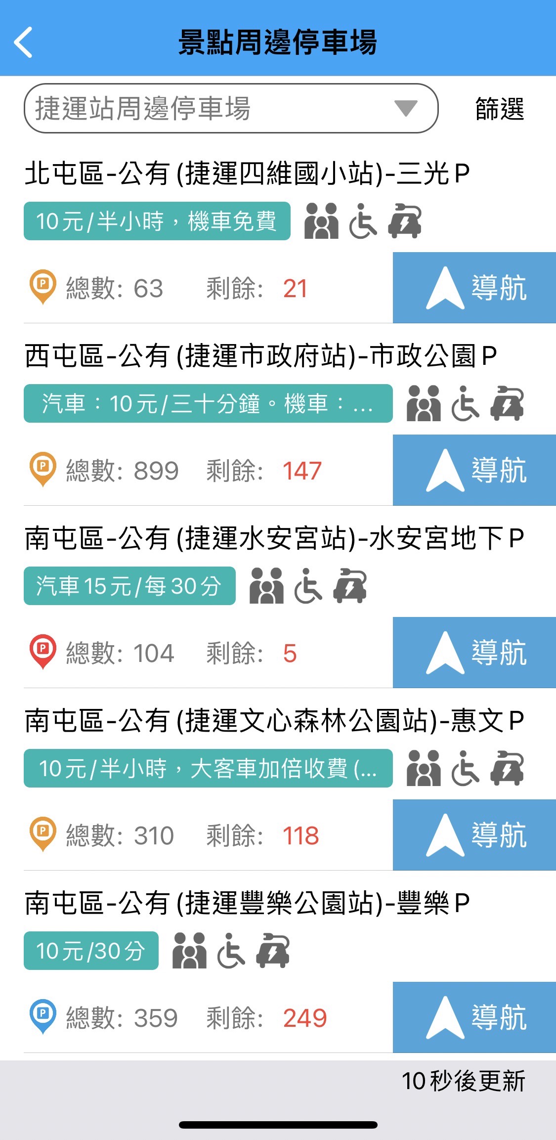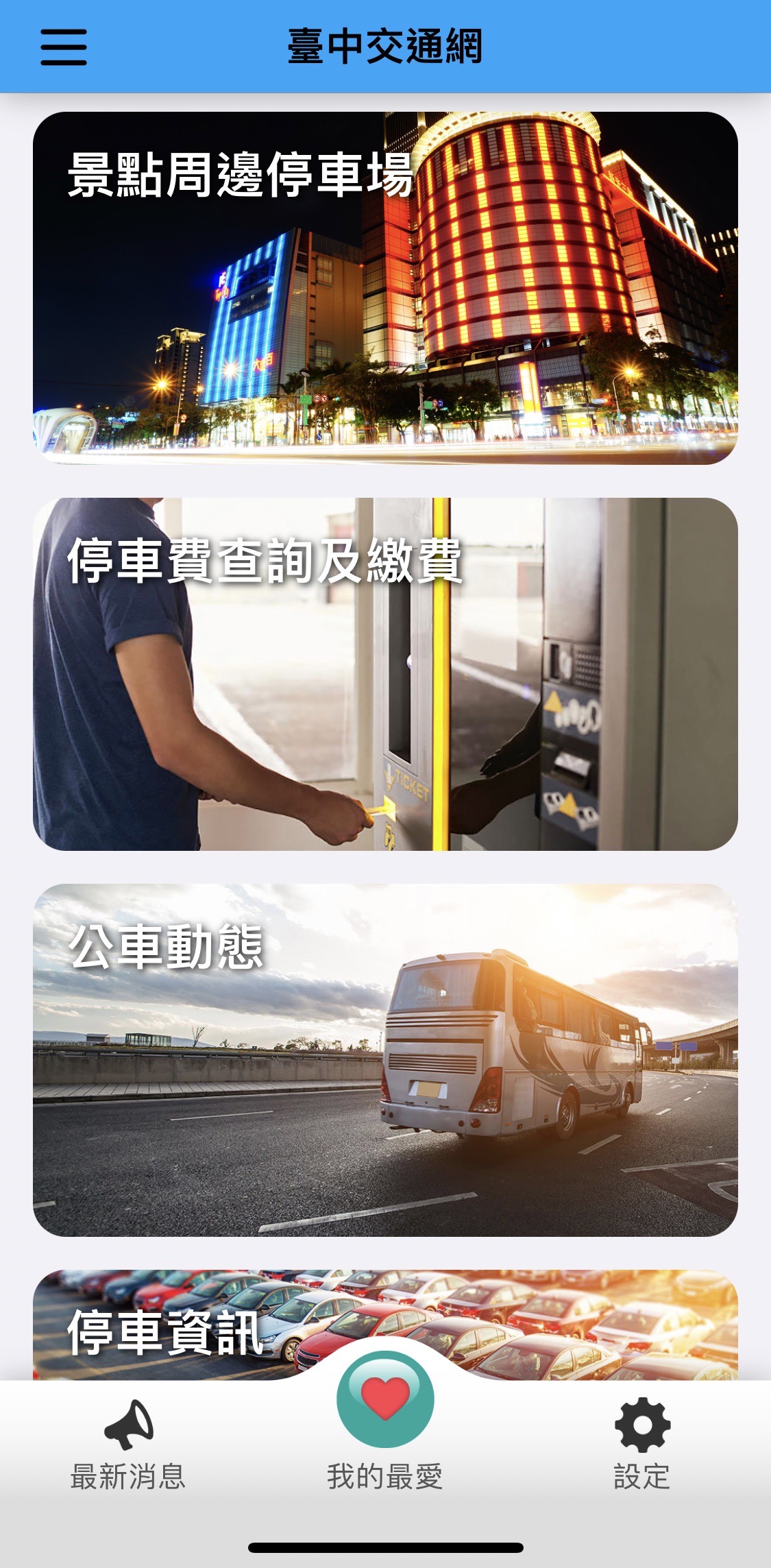 「臺中交通網APP」提供台中市路況、停車資訊、公車資訊等多元交通資訊查詢服務,民眾可透過APP查詢全市停車場資訊與6,491格路邊地磁感應車格即時資訊,其中「景點周邊停車場」查詢功能包括百貨商圈、休憩景點周邊停車場清單與即時剩餘車位查詢服務,讓民眾出門不用煩惱找停車位,歡迎踴躍下載使用。