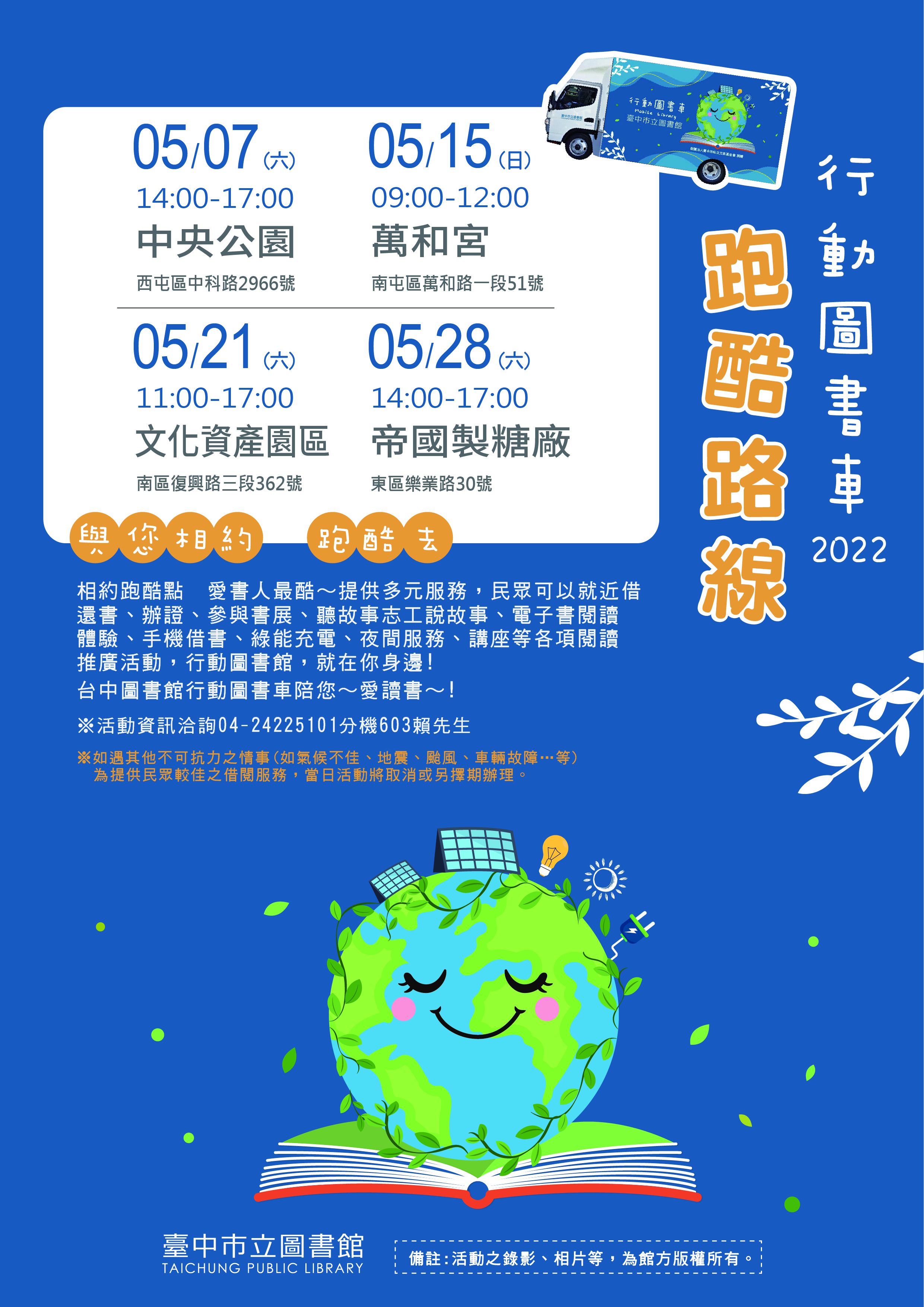 中市圖指出,台中市第一部「智慧綠能行動圖書車」今年2月底新上路,擁有亮麗藍的嶄新外觀和太陽能充電等環保綠能輔助,格外搶眼;台中市目前共有7部行動圖書車,服務遍及全市29個行政區,從5月開始,智慧綠能行動圖書車更新増中央公園、帝國製糖廠人氣景點,將圖書資源帶到民眾身邊,推廣城市閱讀,歡迎民眾一起體驗書車服務,享受閱讀樂趣。