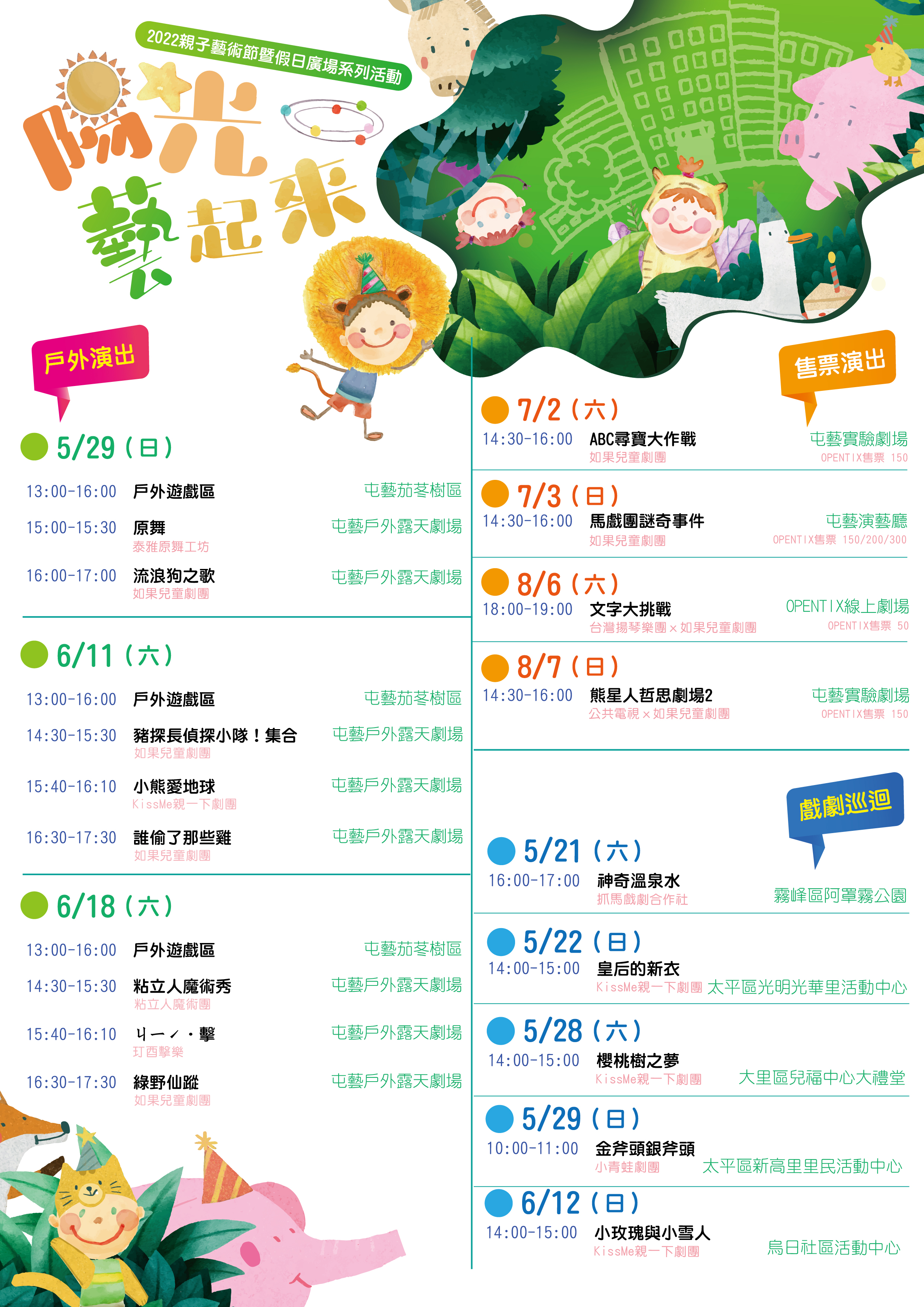 屯區藝文中心說明,「2022親子藝術節暨假日廣場系列活動」詳情及售票資訊,可至中心官網( www.ttdac.taichung.gov.tw )、臉書粉絲專頁( https://www.facebook.com/ttdac )查詢,活動如因疫情等因素異動,以官網公告為主。因應國內疫情,屯區藝文中心均落實中央流行疫情指揮中心防疫規範,請民眾參與活動時配合量測體溫、手部酒精消毒、全程佩戴口罩及保持安全社交距離,並鼓勵大家完成第三劑疫苗注射及手機下載「台灣社交距離」APP,安心參與各項活動。