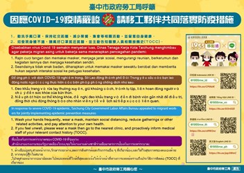 台中市為全國移工人數第2高城市,聘僱移工的企業達9千餘家,台中市政府勞工局與企業建立橫向聯繫管道,協助企業落實移工防疫措施,並即時掌握移工確診情況,持續提供即時資訊滾動檢視防疫作為,保障勞雇雙方權益及國內防疫安全。