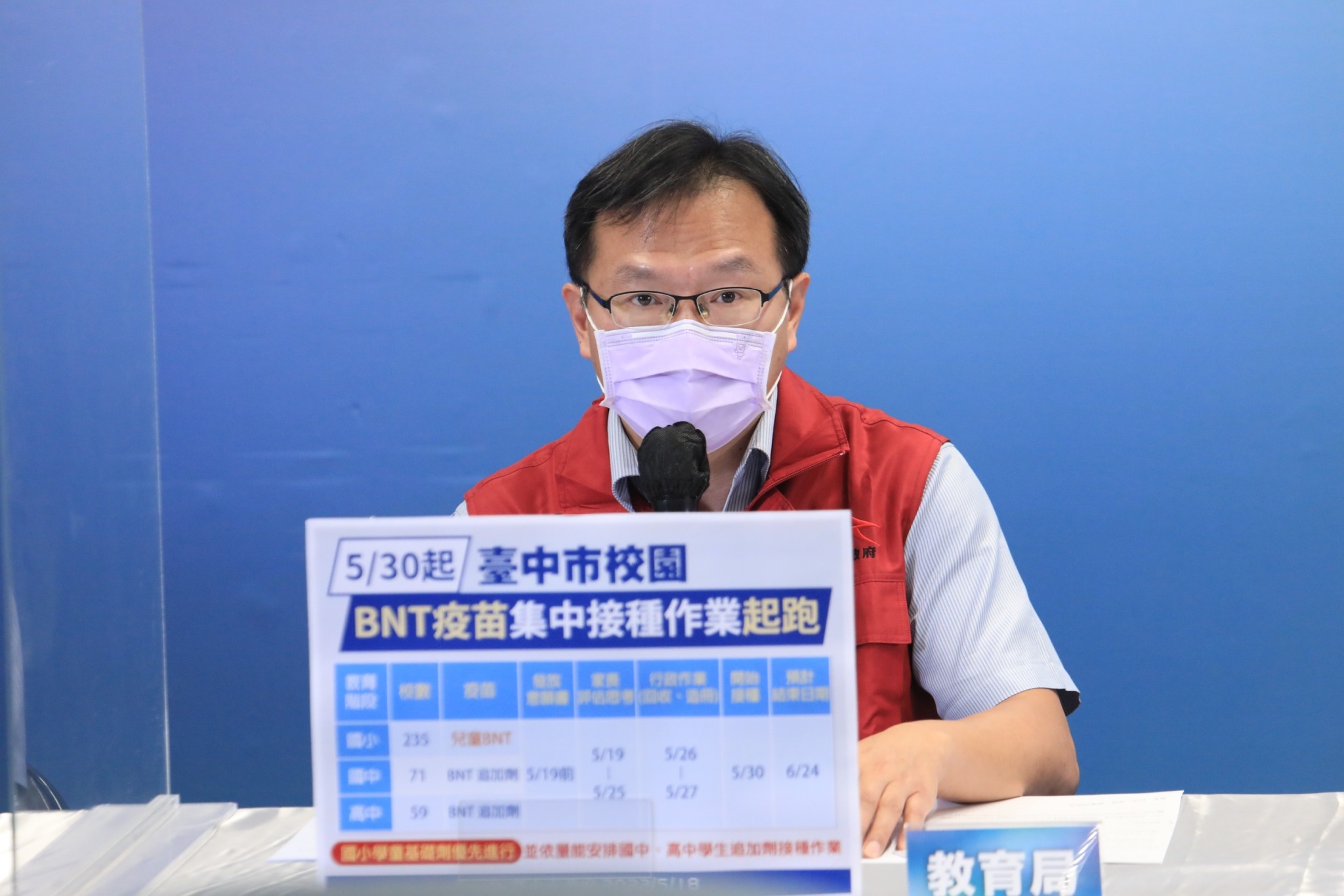盧市長也提到,教育局從昨日起在國小與國、高中進行接種疫苗的接種須知及意願書印製工作,家長於明日之前能拿到接種須知及意願書,後續將依中央所規劃的期程,啟動台中市校園集中接種作業,此次接種對象將包含國小學童的基礎劑,以及國中、高中學生的第三劑(追加劑)