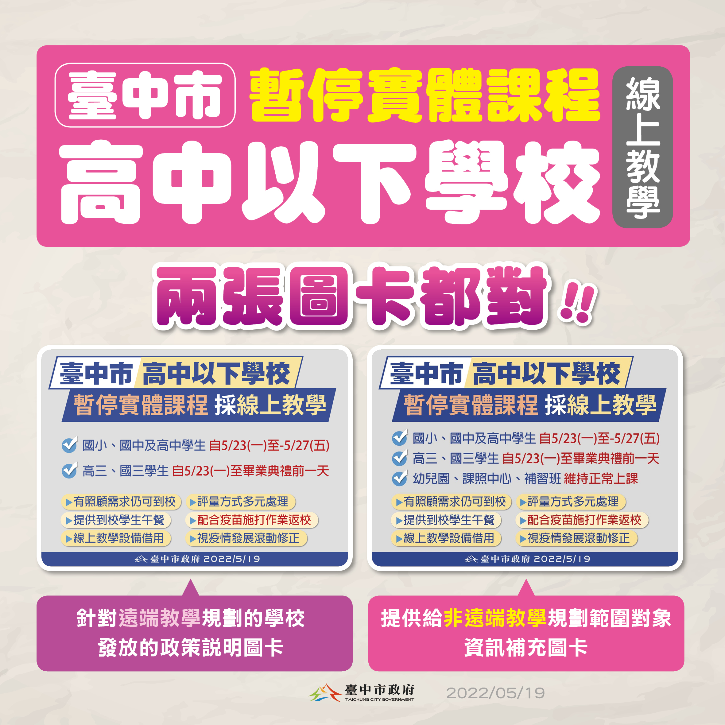 至於教育局遠端教學圖卡,出現兩種版本的情況,市府指出,這是提供對象不同的差異,政策內容並無不同,只是強調的重點不一樣,兩個版本都是正確版本,不會有兩張圖卡相互矛盾的情況,請師生家長安心。(5/20*2)*教育局
