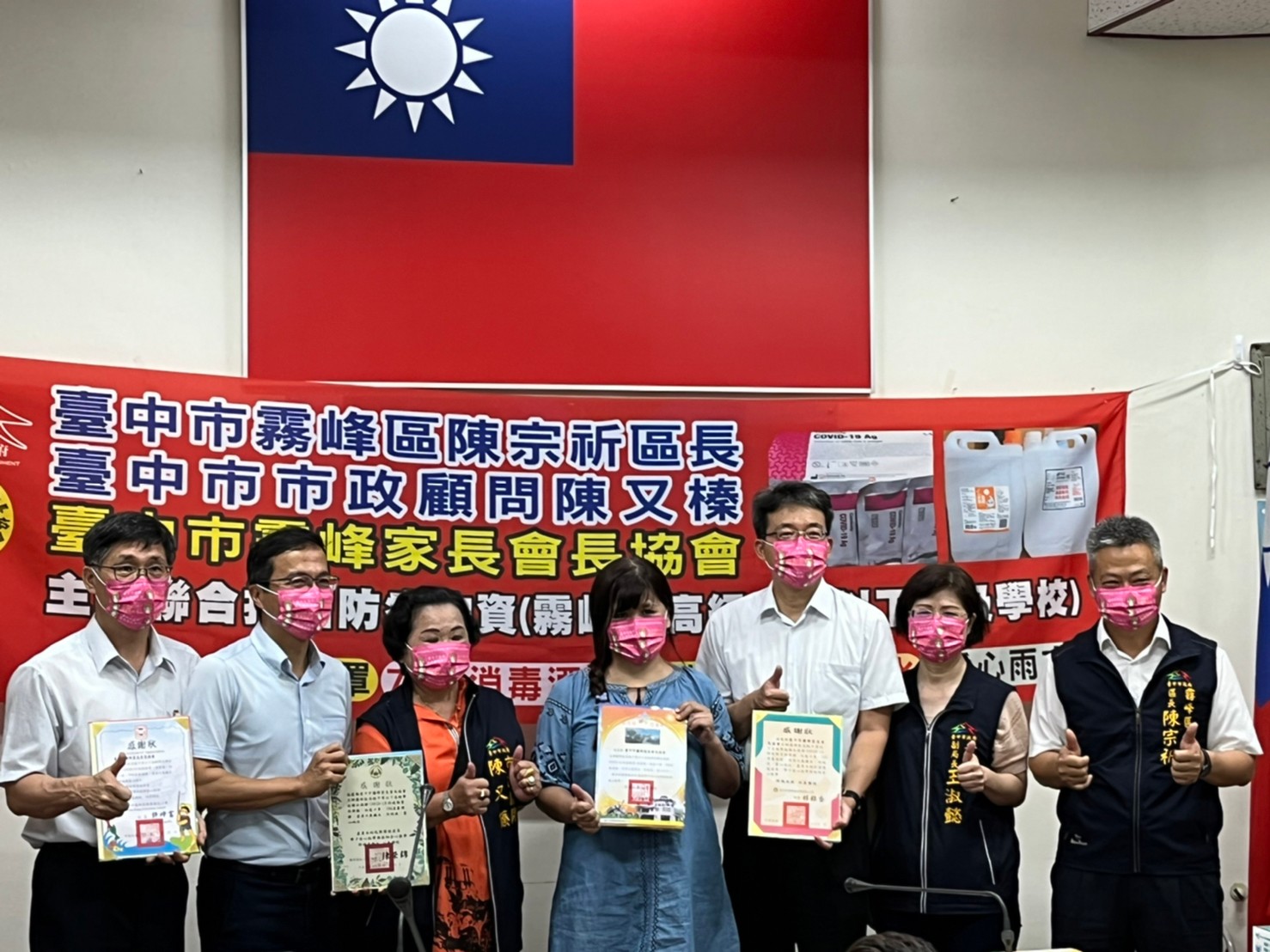 教育局表示,疫情持續延燒,快篩試劑需求大增,但坊間快篩試劑供不應求,且試劑多由中央配發,不易取得,感謝台中市霧峰家長會長協會、台中市珍貴教育關懷協會、台中市益生獅子會、太平大同獅子會、中華民國柳樹湳三官大帝弘孝會、台中市立霧峰農工校友會、霧峰天后宮、霧峰本鄉里福德祠、聖賢傳德基金會、金進億營造有限公司及貝佳實業有限公司,及時提供快篩試劑200劑、防疫口罩1 萬5,000片、75%消毒酒精1,200公升、清消次氯酸水560公升、愛心雨衣1,400件及防蚊液100瓶等多項防疫物資,讓學校進行防疫工作時彈性運用。