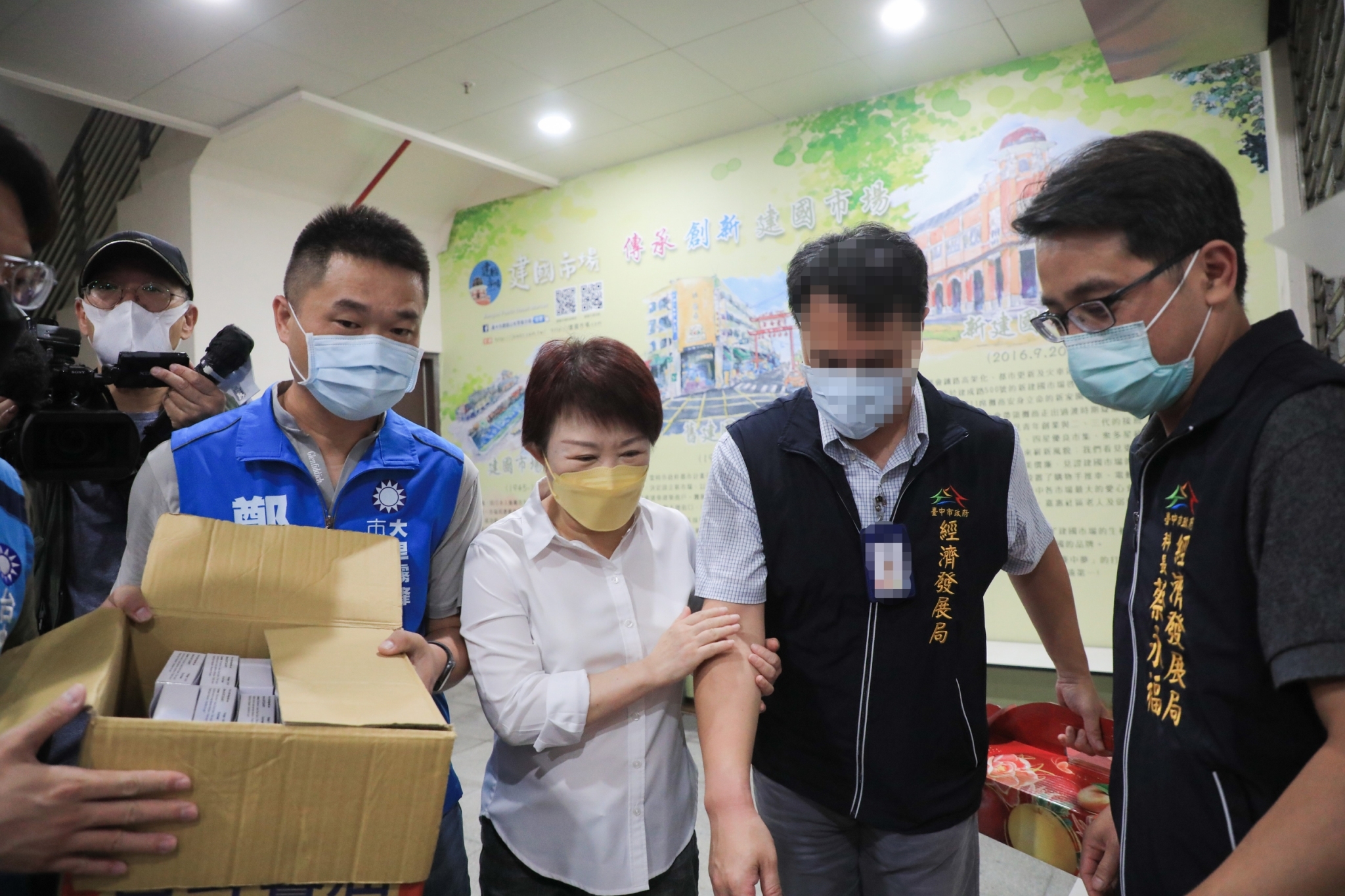 國內疫情嚴峻,台中市政府經濟發展局近日加強辦理各公民有市場及夜市防疫稽查,日前一名市場管理員同仁勸導建國市場一攤商雇用的員工佩戴口罩時,卻遭其出言恐嚇及施暴,市長盧秀燕今(5)日前往建國市場慰勉受傷同仁,她感謝同仁嚴正執法,也感到相當不捨,盧市長強調,對於漠視市場防疫規定者,絕對嚴懲究辦,讓市府成為執法同仁的堅實後盾。