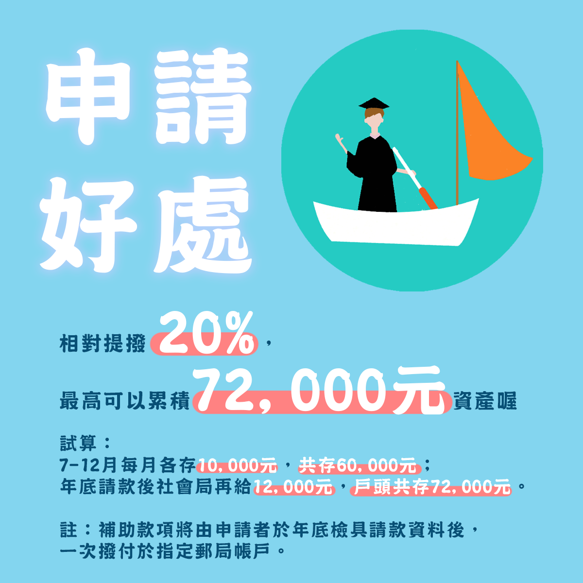 社會局說明,申請者可於線上申請時選擇每月存款5,000元、7,500元或10,000元(擇一繳存金額,以不可變更為原則),自行至任一金融機構開立零存整付儲蓄帳戶,並按月自薪資轉存至該帳戶。社會局依實際繳存額度,相對提撥20%,每月分別補助1,000元、1,500元或2,000元,今年度辦理期間自7月至12月止,最高補助12,000元。申請者於年底檢具請款資料後,補助款項將一次撥付於指定郵局帳戶。