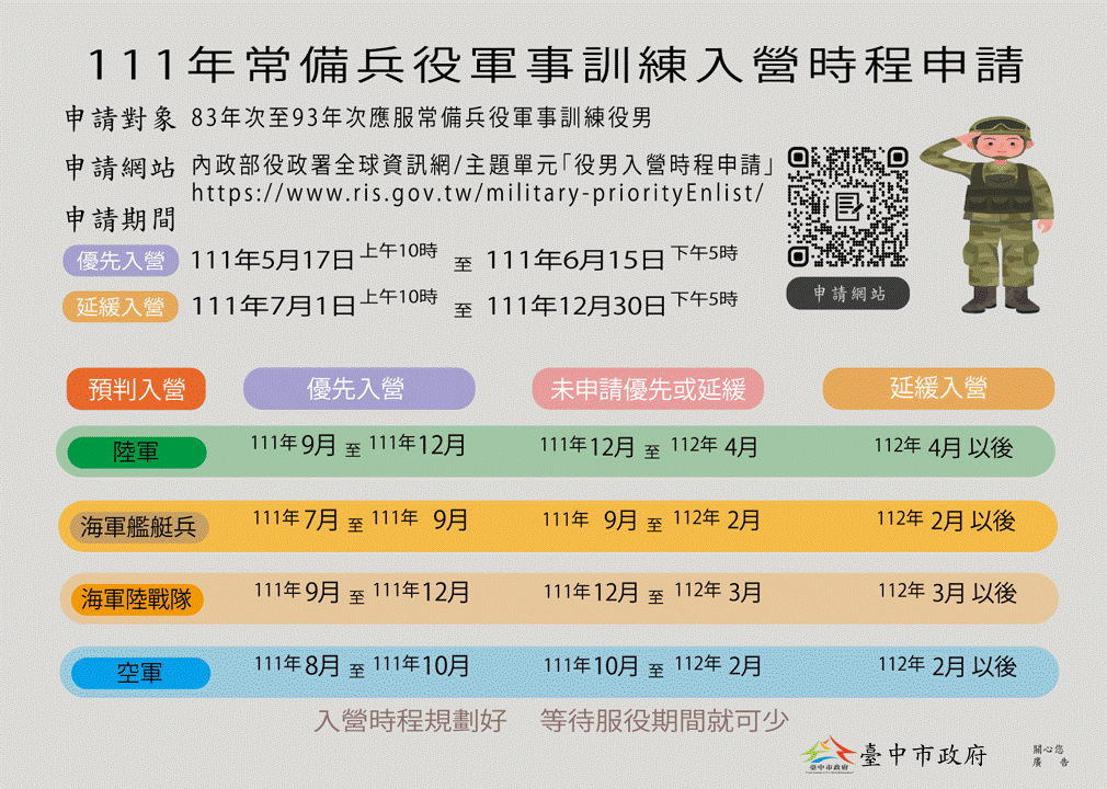 中市役男有意優先入伍 6月15日前請儘速線上申請