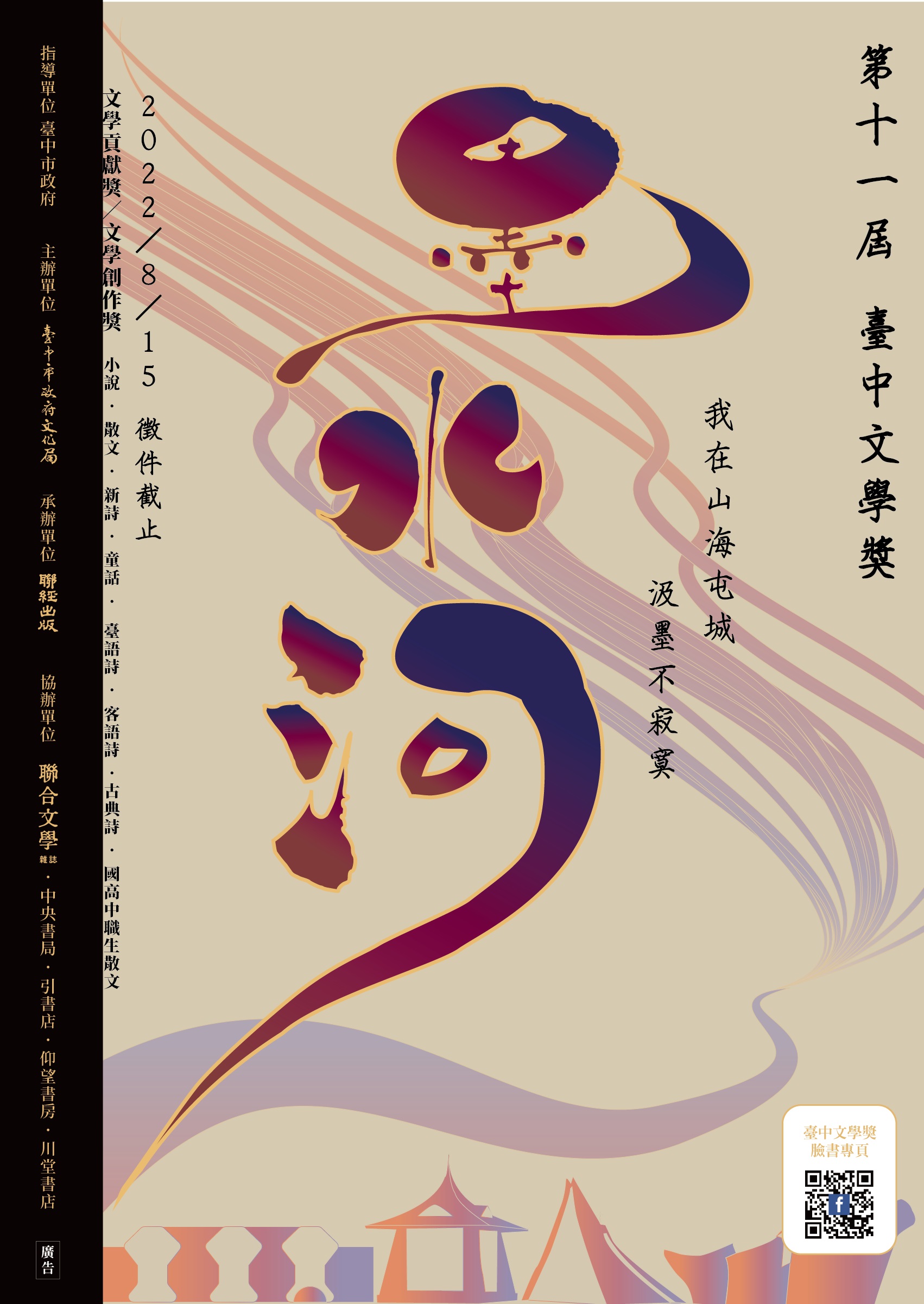 「第十一屆台中文學獎」徵件起跑!台中市政府文化局今年同時辦理「文學貢獻獎」及「文學創作獎」徵件,總獎金高達148萬5千元,即日起至8月15日止開放收件,文化局今(9)日也發表徵件形象影片,邀請第7屆文學貢獻獎得主周芬伶、作家謝凱特及兩屆國高中職生散文組得主黃宥茹擔任代言人,以不同世代文學創作者的心靈交會,帶出今年活動主題「墨水河—我在山海屯城,汲墨不寂寞」,歡迎全球以華文創作的朋友踴躍參與這場年度文學盛會。