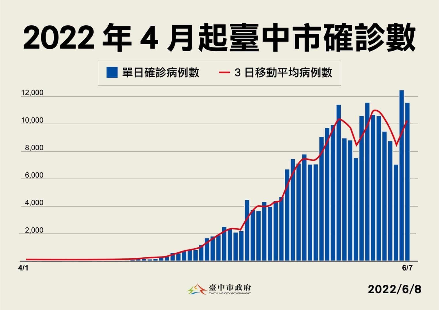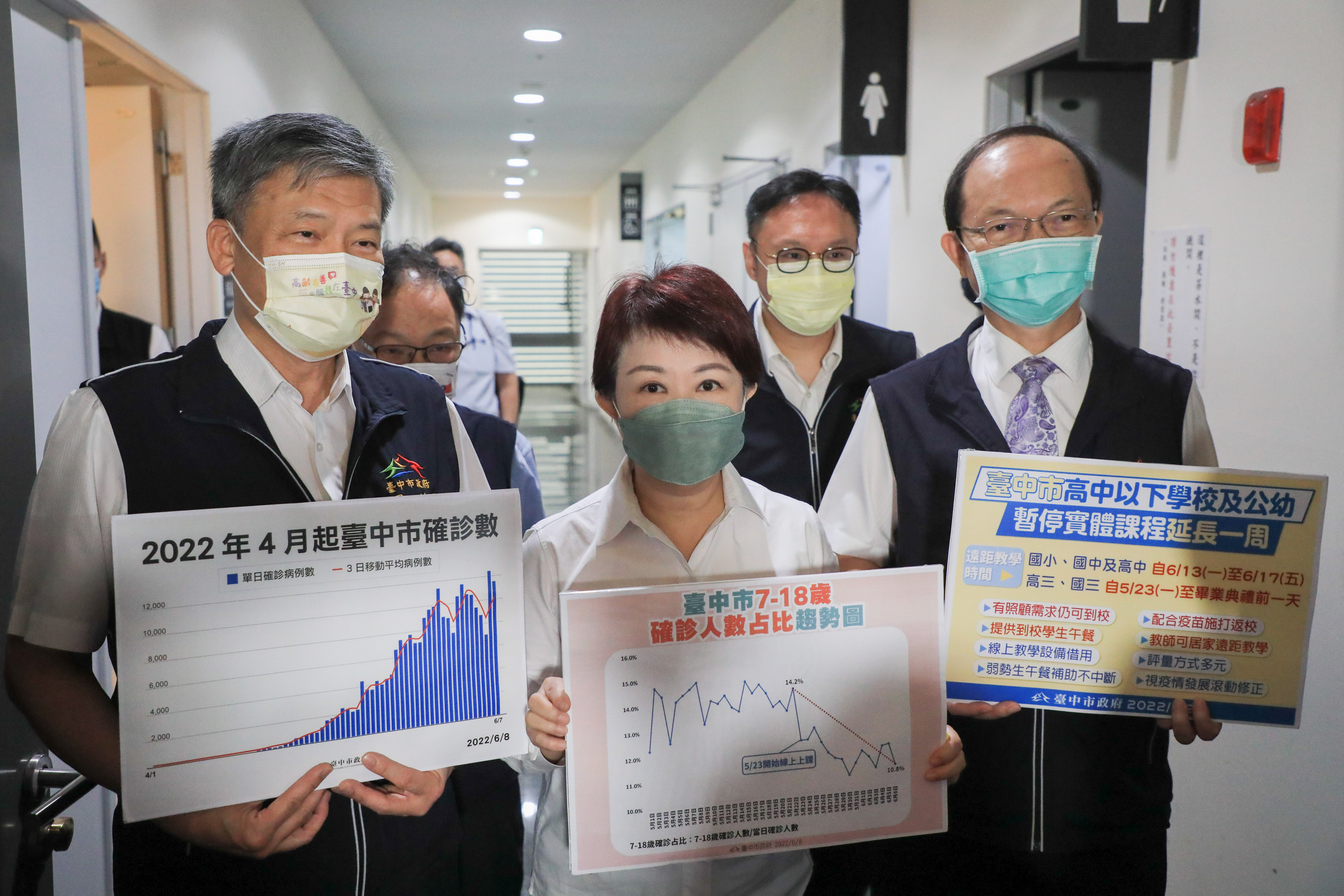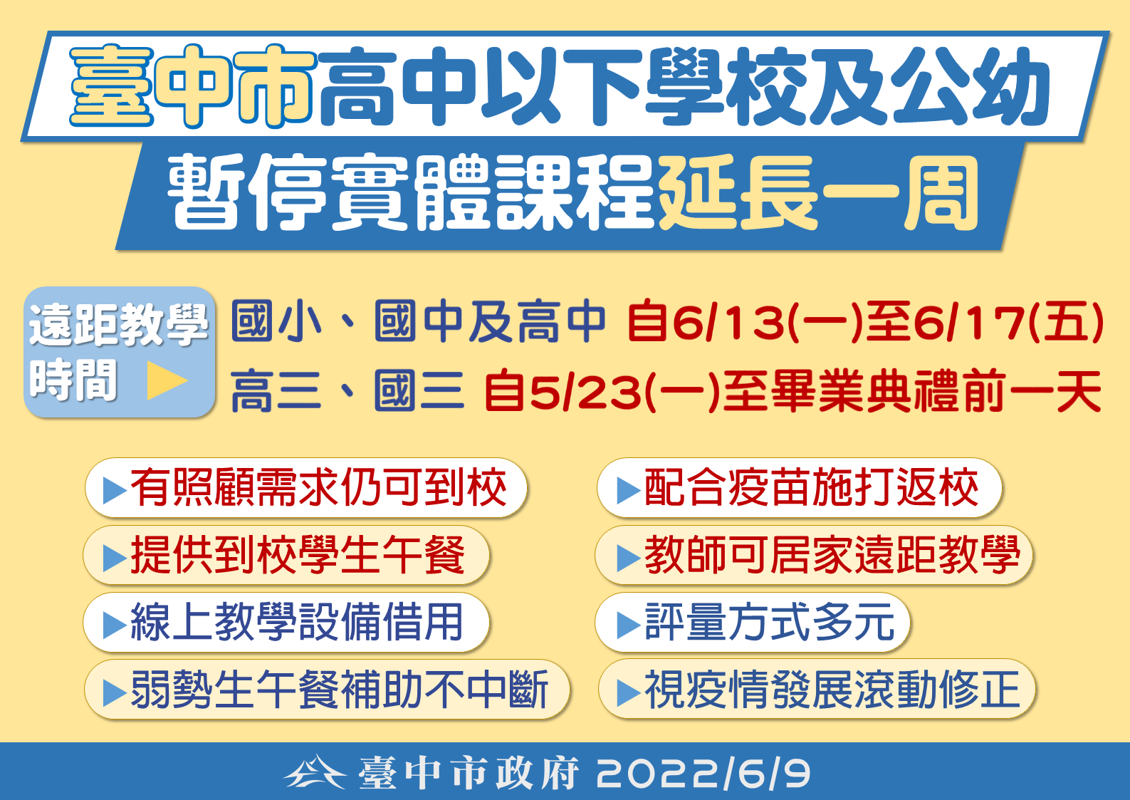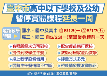 台中市高中以下學校原訂暫停實體課程至6月10日止,改採遠距教學,公幼部分暫停實體教學,私幼則開放與家長協商後自行決定停課與否。因台中疫情仍處高原期,台中市政府教育局聽取八個家長團體意見後,考量到孩童的防護力,市長盧秀燕今(9)日再宣布,「停課不停學」措施再延一週,從6月13至17日止仍暫停實體教學,後續將視疫情發展再滾動檢討。