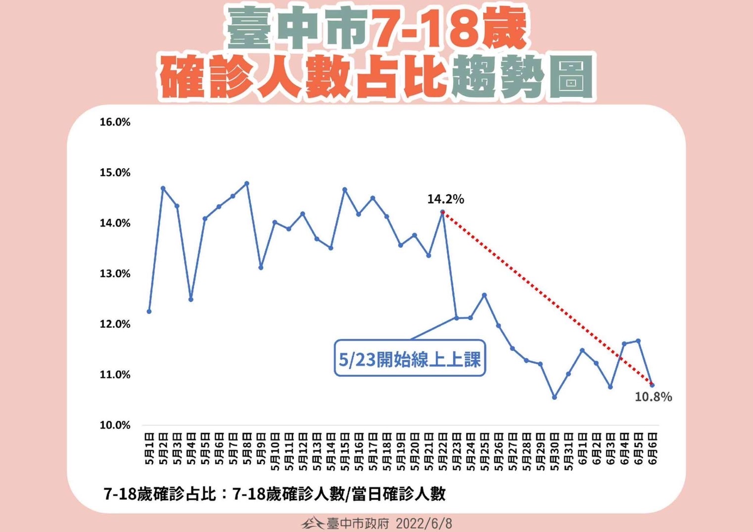 盧市長說明,台中市高中以下暫停實體課程,改採線上教學是從5月23日開始,7至18歲的確診人數占比曲線,呈現往下走的趨勢,即便台中近幾天單日確診數上萬,但7至18歲的確診人數占比曲線沒有上升,顯示市府「停課不停學」的措施,對避免孩童在校群聚而確診有一定程度的幫助。