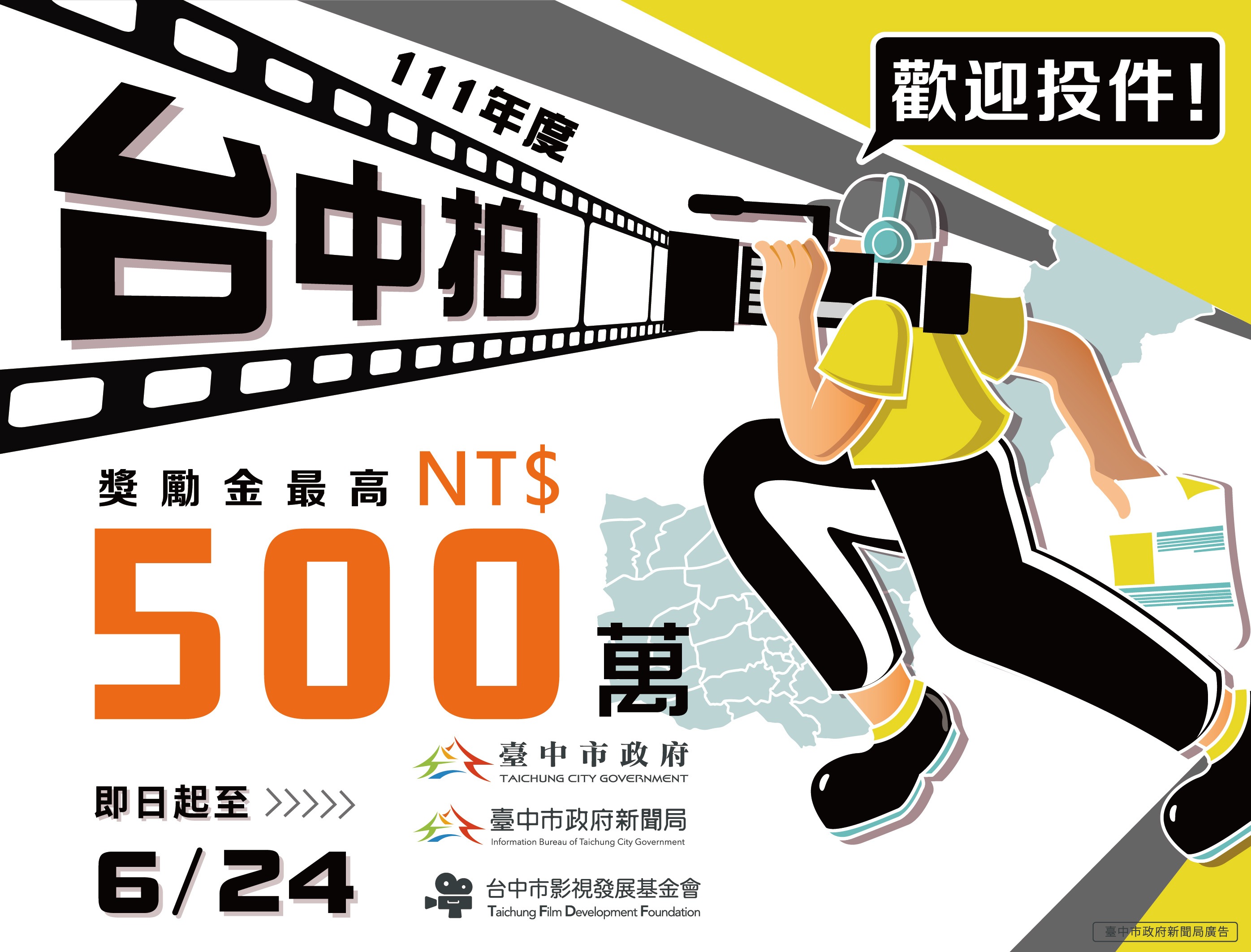 「台中拍」獎勵電影事業徵件進入最後倒數!在台中市政府及新聞局大力支持下,由台中市影視發展基金會主辦的獎勵電影事業計畫今年已邁入第五年,為提升電影產業後製及行銷品質,除企畫階段的作品,後製階段或上映前行銷階段的製作案皆能參與,報名將於6月24日截止收件,提醒全國電影業者把握最後投件機會,爭取最高獎勵金500萬元!