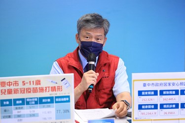 針對今日確診案例數,令狐副市長說,通常假日篩檢人數較少,近日確診人數下降可能是屬於「假日效應」,各位市民朋友防疫仍不能鬆懈。有關兒童疫苗部分,他指出,台中兒童疫苗施打涵蓋率穩定攀升,統計至昨日為止,兒童莫德納已施打3萬7200人、兒童BNT已施打11萬2923人,總共已施打15萬123人,覆蓋率已經達到77.38%。目前台中5至11歲幼兒接種完成率優於全國的72.5%,六都排名第三。