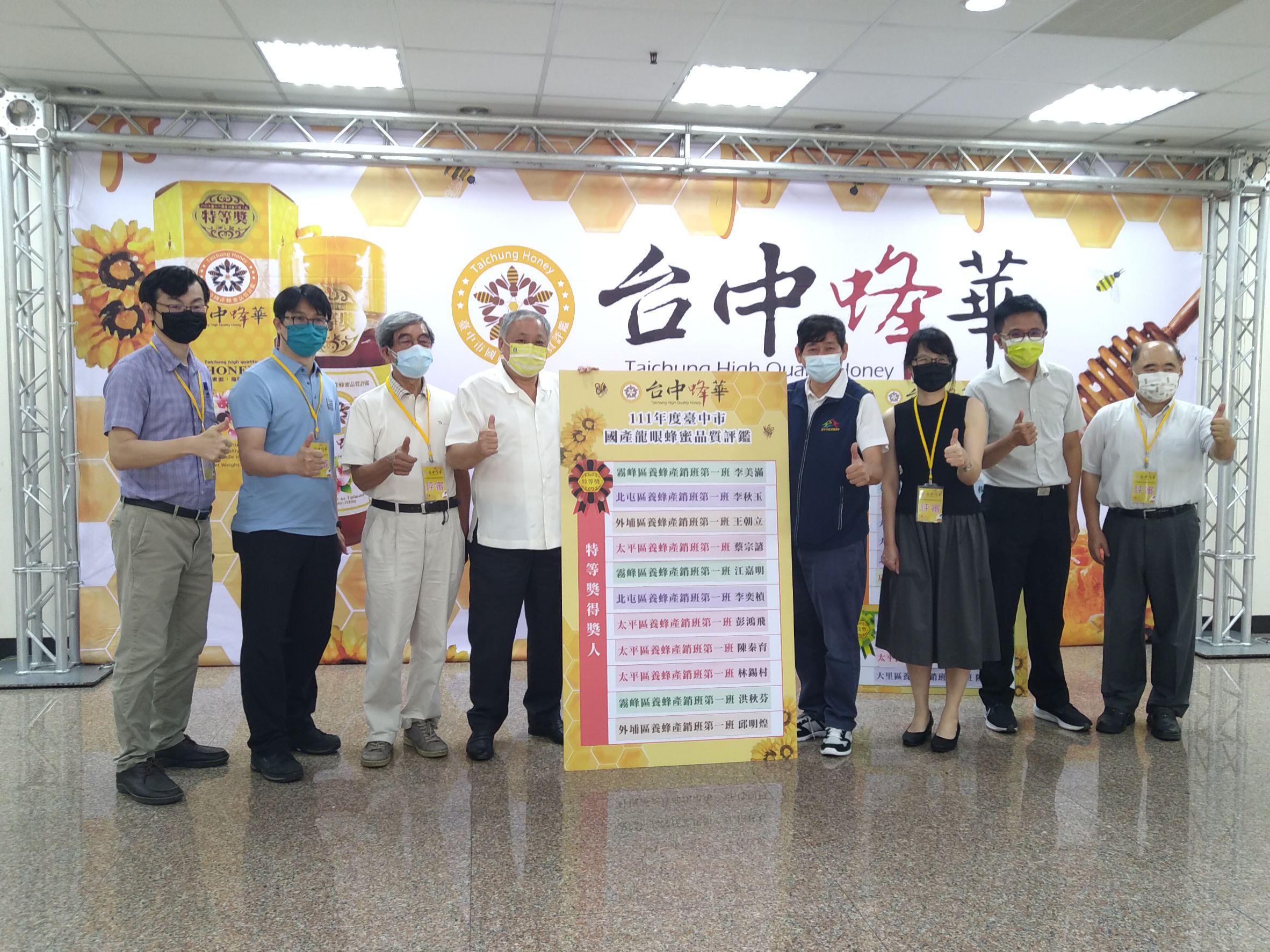 台中市政府農業局輔導太平區農會今(15)日舉辦「111年度台中市國產龍眼蜂蜜品質評鑑」,鼓勵台中市養蜂產銷班蜂農踴躍參加,透過各項安全品質儀器檢驗及嚴謹的感官品評程序,評選出最優良的蜂蜜產品。農業局表示,這次共有11位獲特等獎、21位獲頭等獎、4位獲優良獎,共36位蜂農獲獎,並以「台中蜂華」做為品牌推廣行銷,期能增加產品附加價值,獲得消費者青睞,增加農民收益。