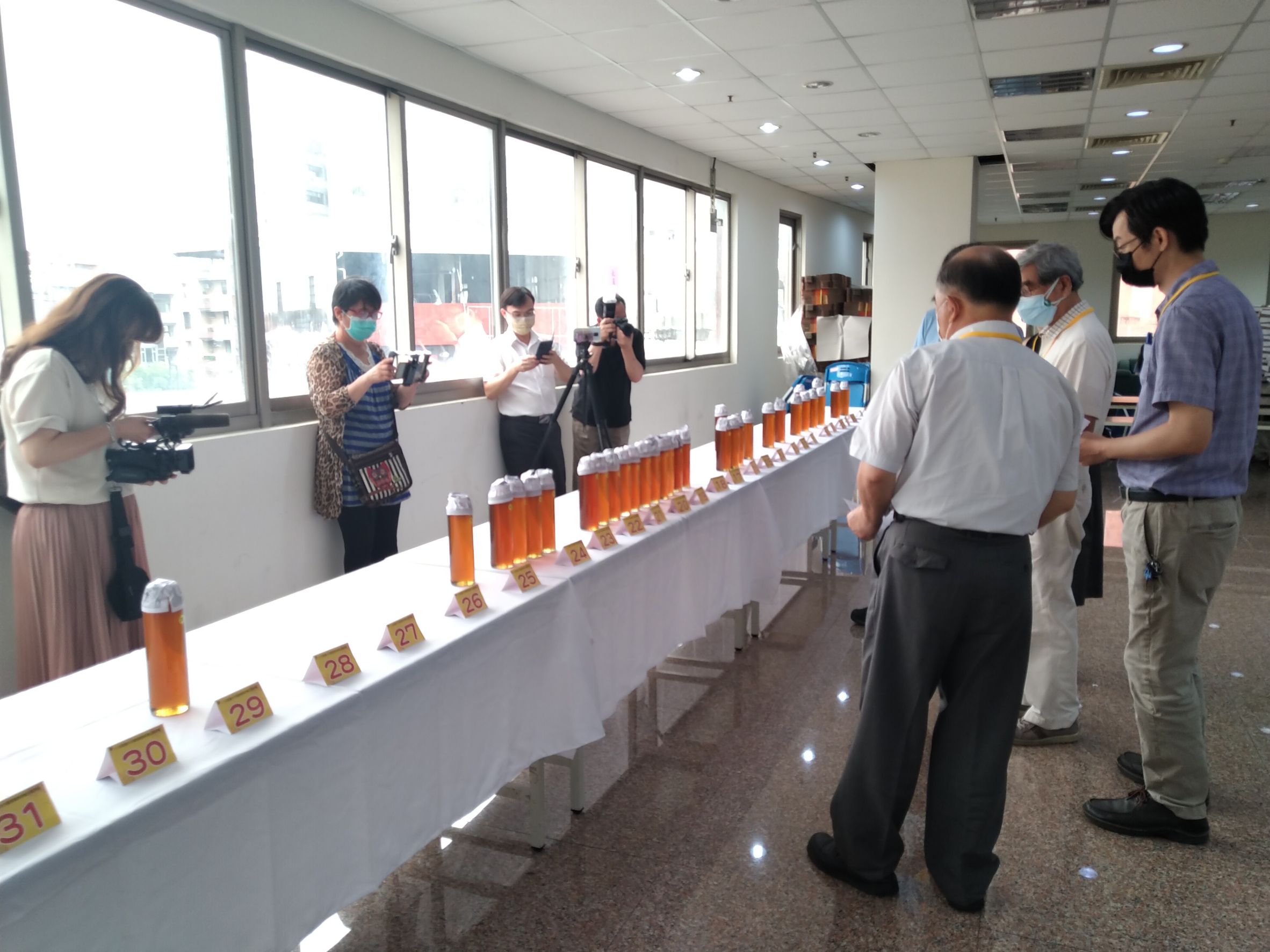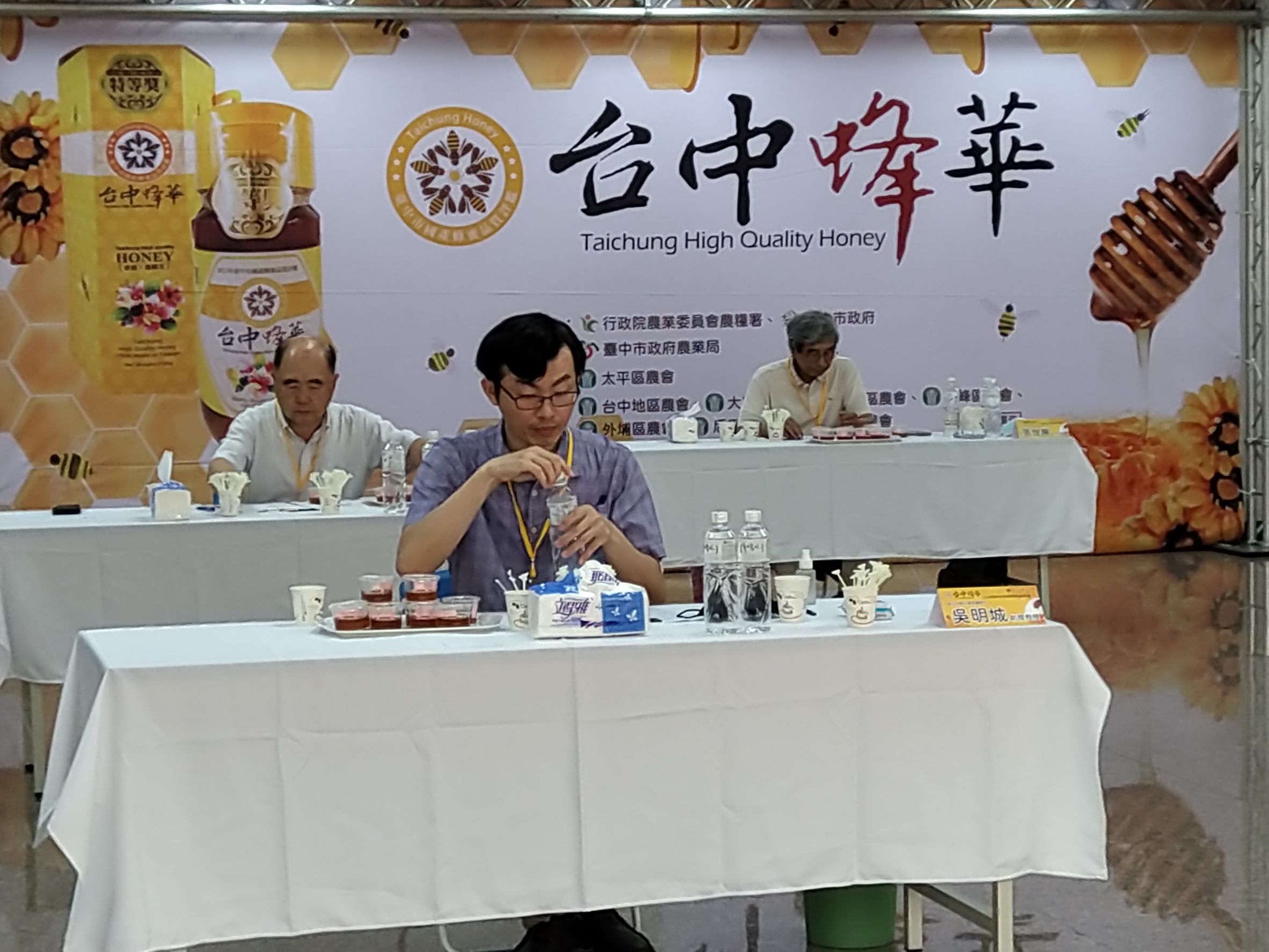 農業局指出,今年度參賽蜂蜜來自太平、大里、外埔、霧峰、北屯、后里及和平等7區養蜂產銷班計37件,符合一般品質標準且無檢出2類11種抗生素類及383項農藥殘留的蜂蜜計36件。感謝行政院農業委員會農糧署的補助及輔導,今日聘請行政院農業委員會苗栗區農業改良場、農委會防檢局、台灣養蜂協會、中興大學及虎尾科技大學等專家學者,對蜂蜜進行風味、香氣及色澤的感官品評。