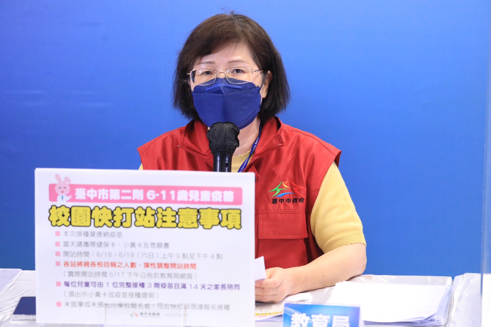 盧市長說,接種兒童莫德納滿四週的學童約2萬8千人已經可以施打第二劑,台中市政府將在這個周六、日(6/18、6/19),在各行政區擇定學校開設兒童疫苗快打站,並依據家長意願,造冊安排施打,學校會通知施打時間和地點,如果家長另有考量,也可以自行預約至醫療院所進行接種。此外,在國高中第三劑疫苗施打的部分,有11萬4980人有意願施打,統計自5月26日至6月15日,累計施打7萬6276人,第三劑疫苗完成率66.34%。