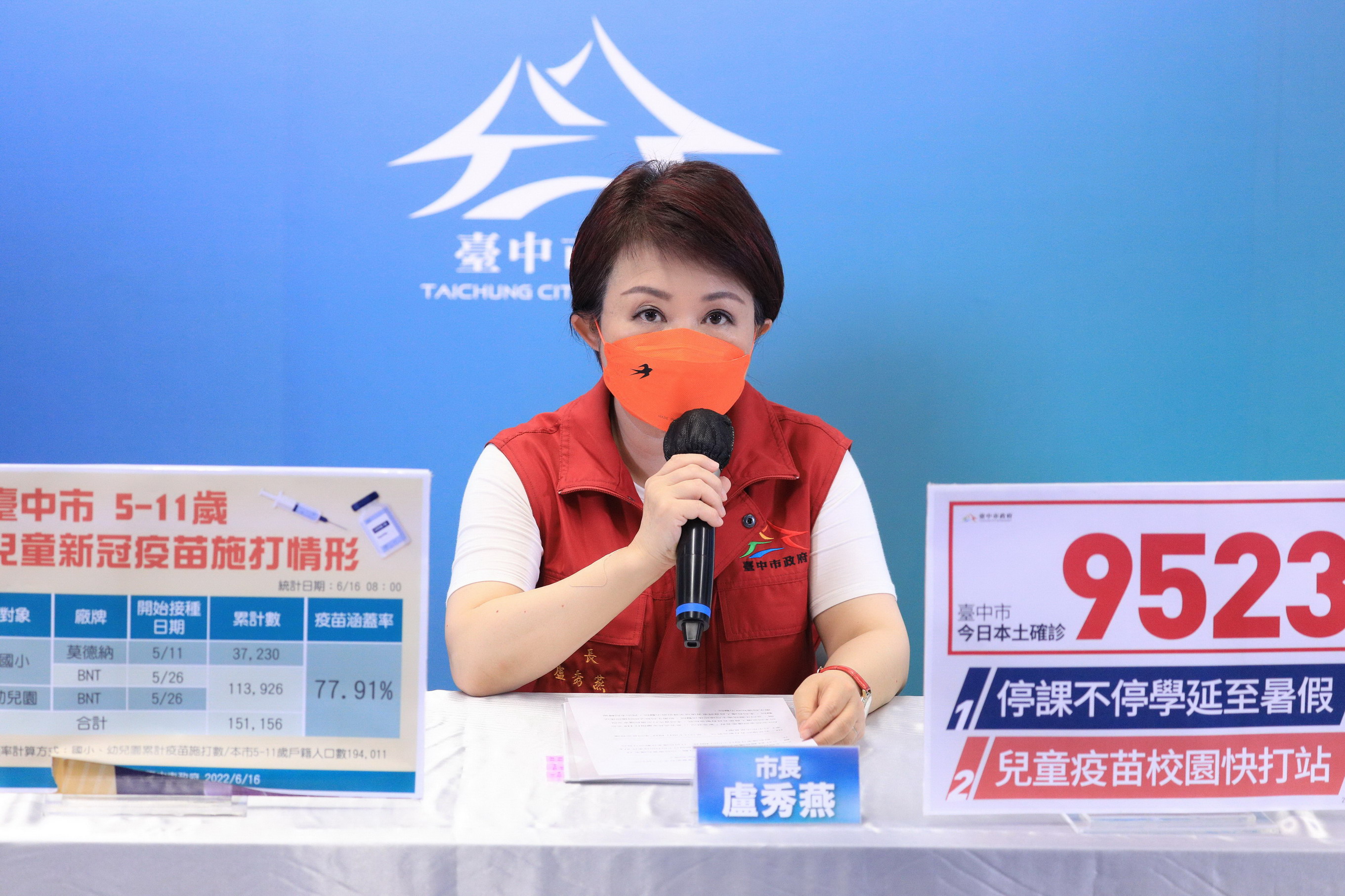 全國今(16)日新增本土確診6萬3,170例,台中市新增9,523例,其中8,962例為快篩陽確診,佔94.11%。市長盧秀燕今日於疫情線上記者會宣布,台中疫情仍處高原期,尚未趨緩,市府聽取家長團體意見後,考量孩童防護力,台中市高中以下學校「停課不停學」措施原至6月17日止,將再延長至6月30日,公幼暫停實體課程,私幼開放與家長協商後自行決定停課與否。