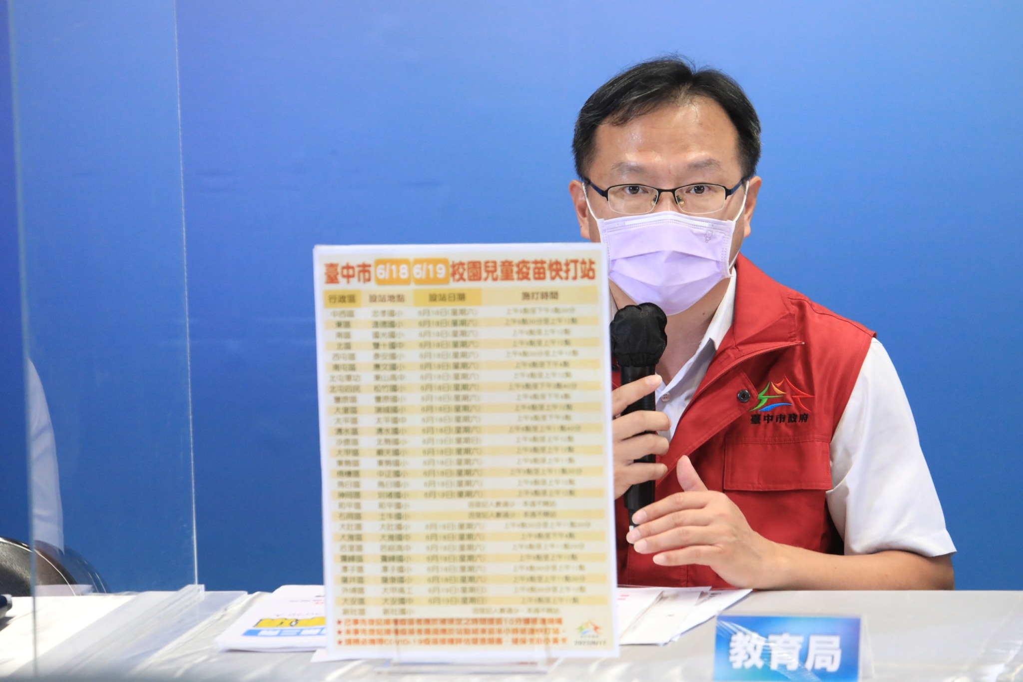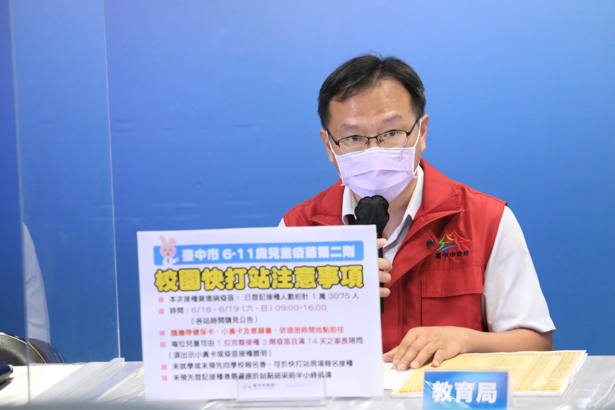 教育局主任秘書郭明洲說明,6月18日將開設23處校園兒童疫苗快打站,6月19日開設沙鹿區北勢國小、外埔區大甲高工、大安區大安國中3處校園快打站,各站實際服務時間可查詢台中市政府官方LINE或教育局網頁公告;他也提醒,符合第二劑兒童莫德納施打資格,但未就學或未預先向學校報名的孩童,可於快打站現場報名接種;未預先登記接種者,最遲應於站點結束前半小時抵達。(6/17*7)