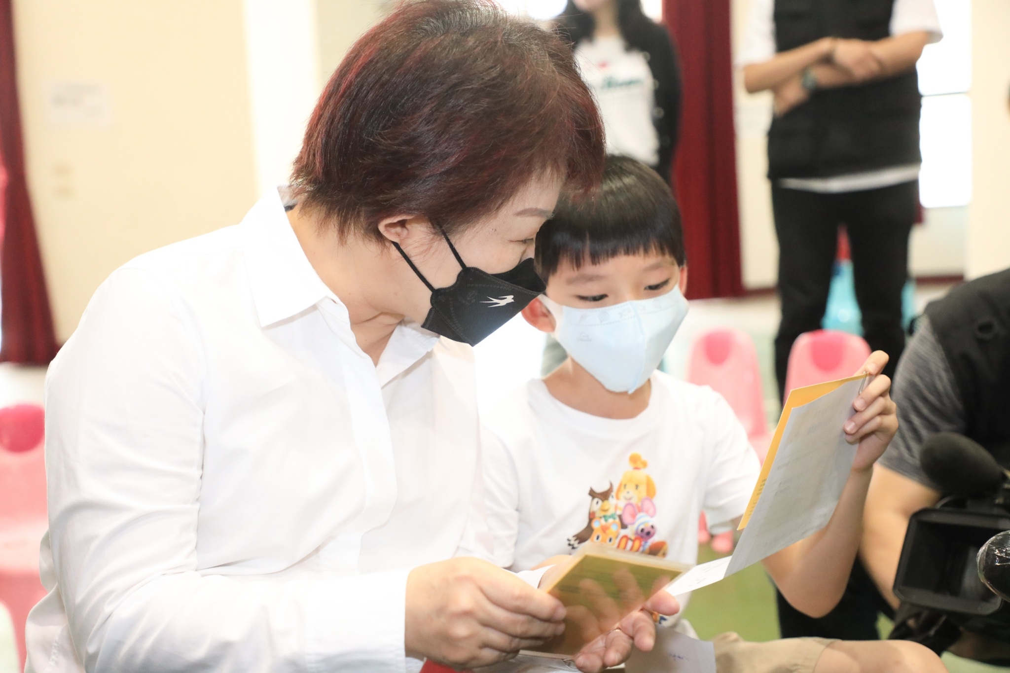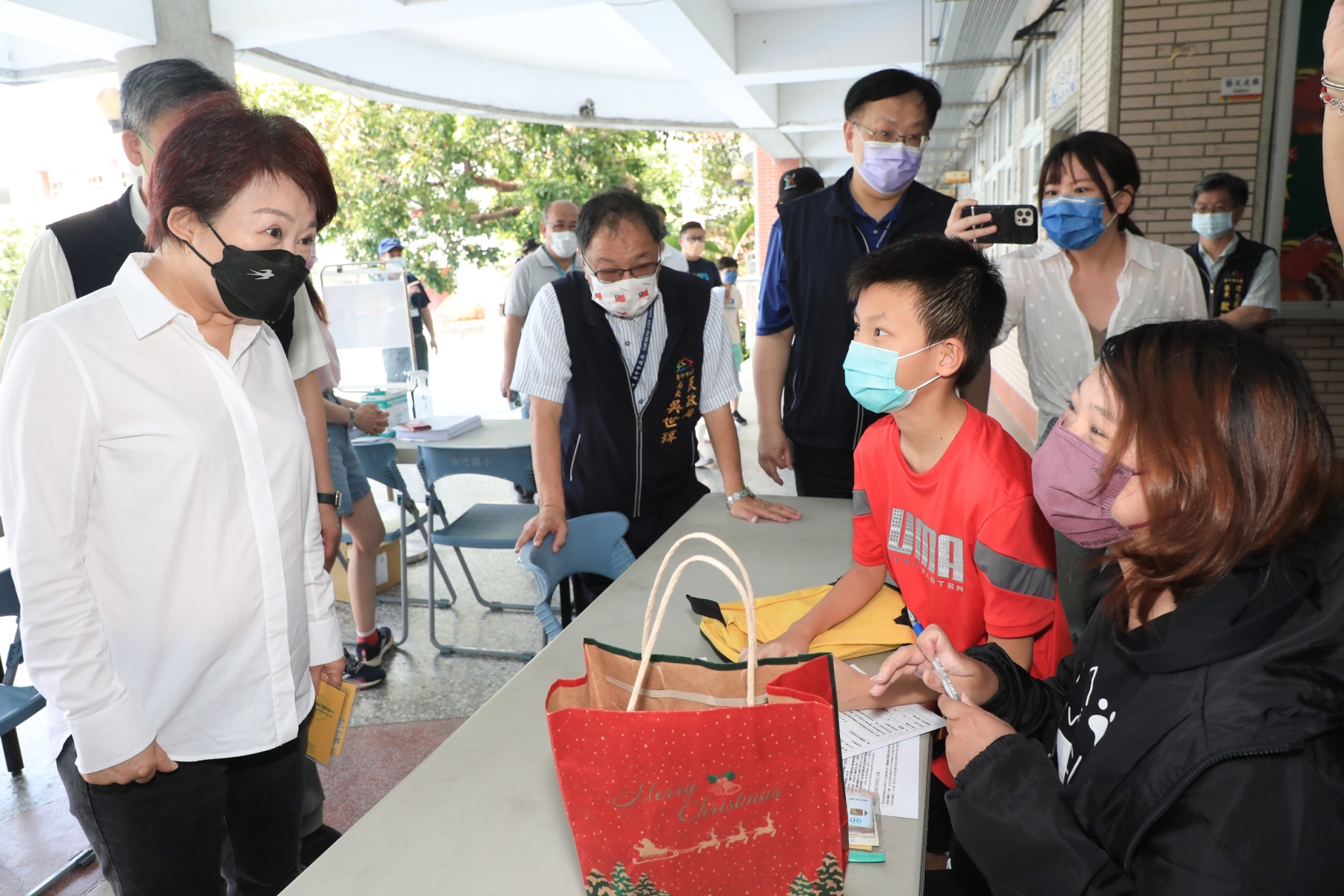 盧市長今日在衛生局長曾梓展、民政局長吳世瑋、新聞局長鄭照新、教育局副局長葉俊傑的陪同下至松竹國小視察。到場時發現就讀文心國小三年級的林小朋友,因媽媽未帶接種三劑小黃卡,現場也無法掃描接種證明,無法陪同入場,因此盧市長暫代林小朋友的媽媽陪打,鼓勵學童勇敢接種,提醒小朋友們接種完要多喝水、多休息。